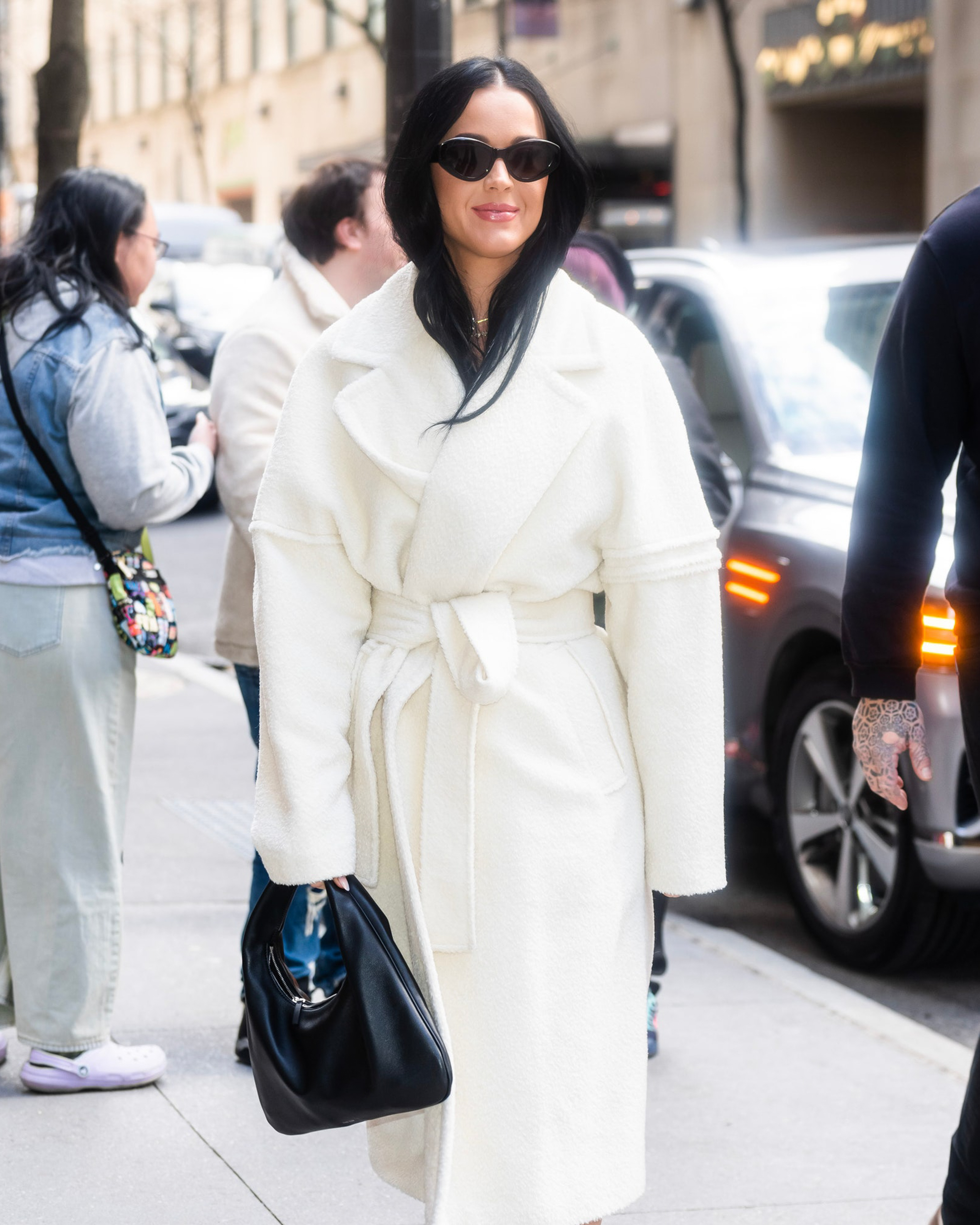 While out running errands in Manhattan, New York, the “Fireworks” singer was the epitome of pared-back sophistication in a cream belted Sentaler overcoat, a black knitted midi dress and dainty black leather buckled mules by By Far. To top it all off? Perry finished the look with the ultimate “stealth wealth” accessories—an elegant pair of black cat-eye shades, as well as a black if-you-know-you-know leather shoulder bag from The Row. The Olsen sisters’s fashion label has been leading the “quiet luxury” movement ever since it launched back in 2006. Perhaps we’re witnessing the beginning of a new era of dressing for Katy Perry.