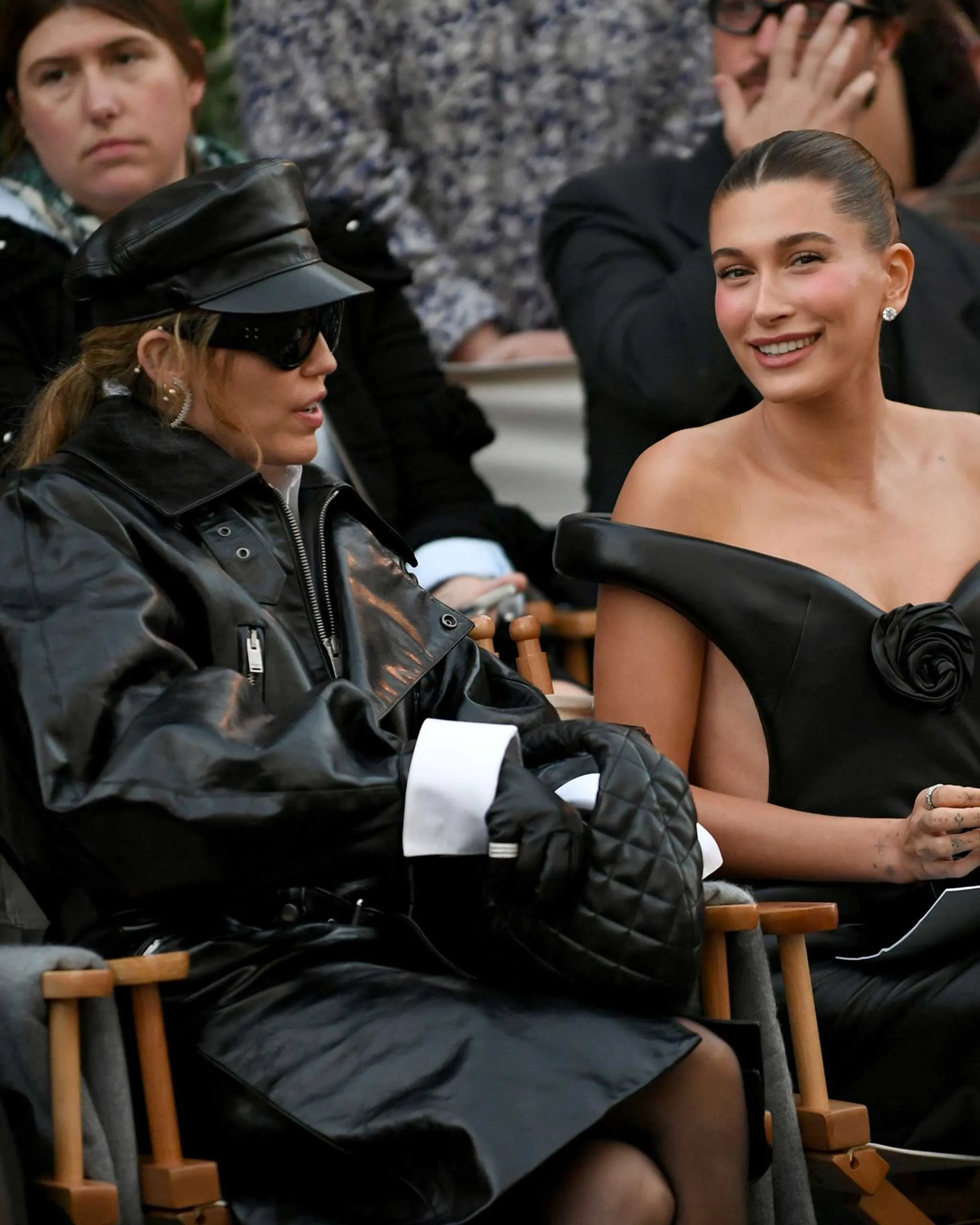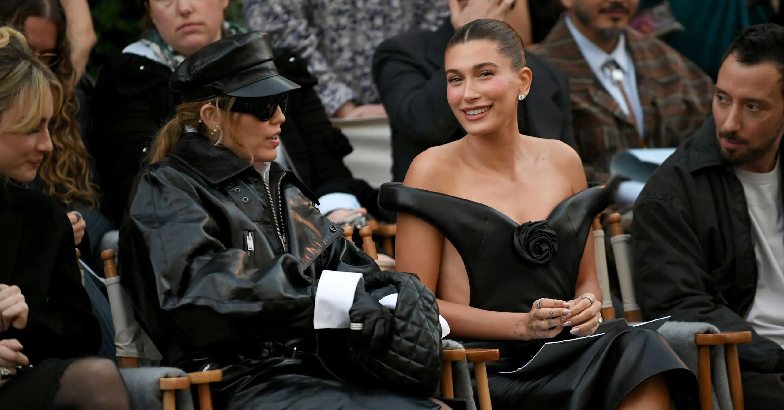 Tonight, the Vogue World: Hollywood show on the Paramount Studios lot proved to be a star-studded event. On the runways, stars like Ayo Ededebiri, Angela Bassett, Jeff Goldblum, and more made some seriously high-fashion cameos. The front row, meanwhile, was just as star-studded. Among A-list sightings that had the whole crowd buzzing was Hailey Bieber and Miley Cyrus, who sat beside each other in matching leather looks.
