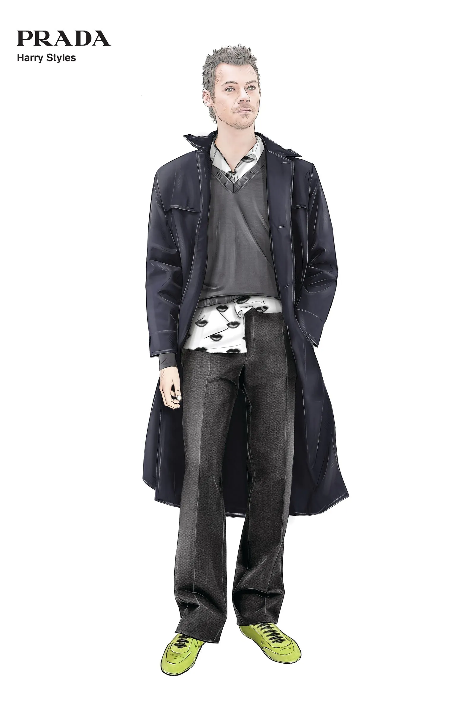 I suppose it’s slightly more cerebral than, say, “As it Was,” and so, in the accompanying video, he wears custom Prada: the thinking man’s brand. The look is grown up, a little hot liberal arts professor, comprising a navy cotton-poplin overcoat, a grey cashmere knit, a shirt, woollen trousers, and lime-green Collapse sneakers. (The slimline-sneaker moment he helped to usher in, it seems, is far from over.) Fashion historians will also clock the lip-stamped print on his shirt as belonging to Miuccia Prada’s spring summer 2000 collection—the same offering that birthed the lipstick motif immortalized by Charlotte York—where it appeared on a pleated skirt worn by Stella Tennant and a be-ribboned vest on Audrey Marnay. Vogue described the collection as “one of the most influential and successful of the season”, praising Prada’s semi-transparent dresses, oversized travel bags, and big sunglasses for their “cosmopolitan panache,” while adding that “it is precisely this knack for endowing classic, seemingly normal clothes with masterful fashion sense that keeps the audience begging for more.”
