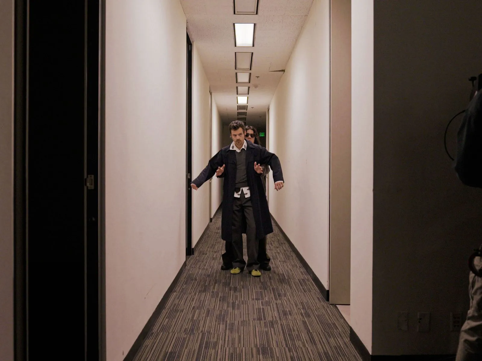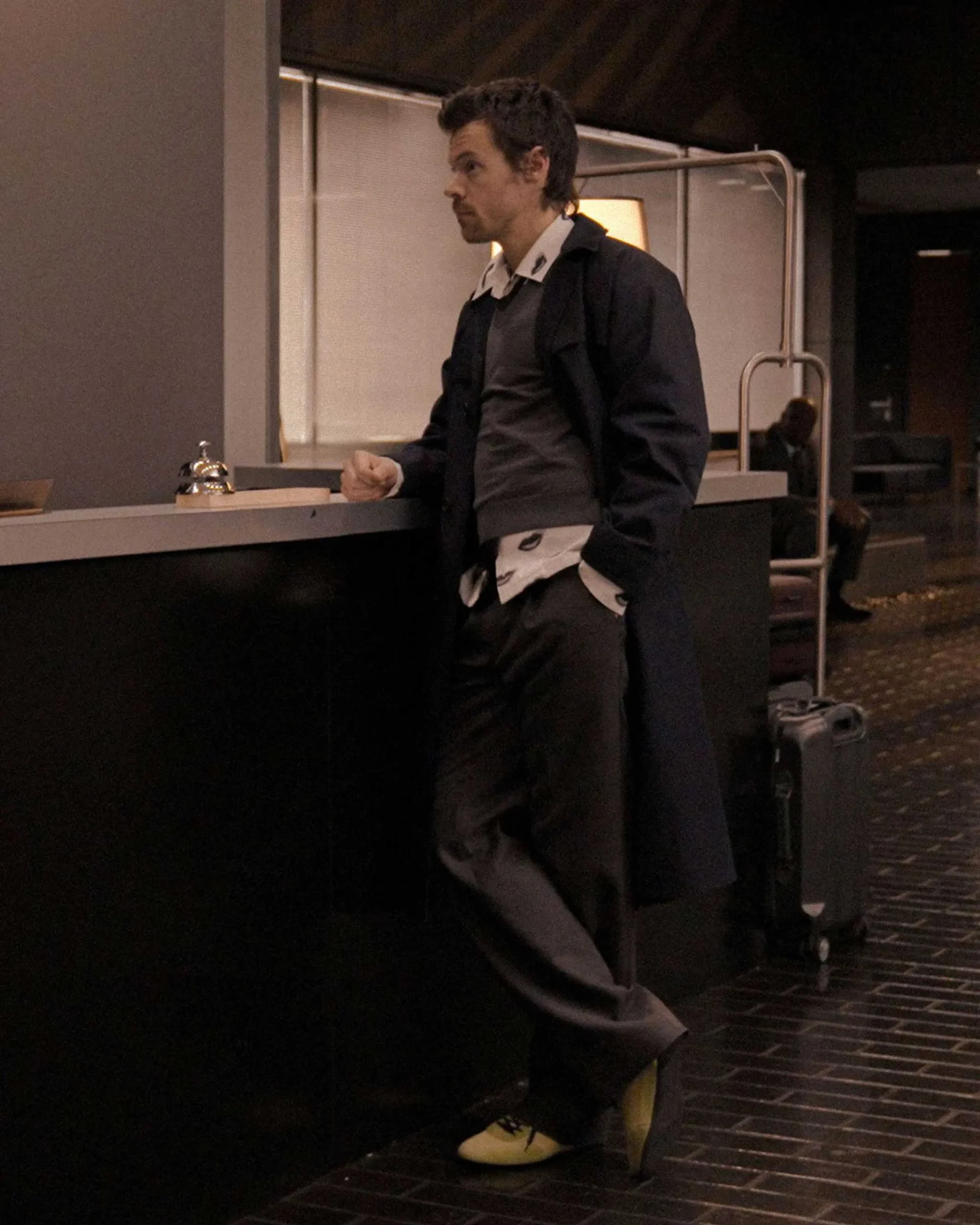 The same could be said of Styles’s subtle but significant style shift during his away years, which saw him enjoy a more civilian, or “normal,” wardrobe. Take, for example, the time he was photographed in Rome in 2024 with Alessandro Michele—the man responsible for all his pussy-bows, feather boas, and flamboyantly flared suits of the late 2010s—wearing a striped t-shirt, Levi’s, and Adidas Sambas. Or, more recently, when he stepped out in a long, grey Olsen-made wool coat and slacks for a walk around north west London in 2025. (In fact, was this not pretty much the same look he wears in the “Aperture” video?) If Styles the performer in spangled jumpsuits and Styles the man in sensible trousers once felt like separate forces, Kiss All The Time. Disco, Occasionally—the artwork for which finds him wearing nothing more than a Patrick Carroll t-shirt and jeans from The Vintage Showroom—suggests that the distance between them may now be narrowing. Though, to be fair, he has always worn dainty sneakers.