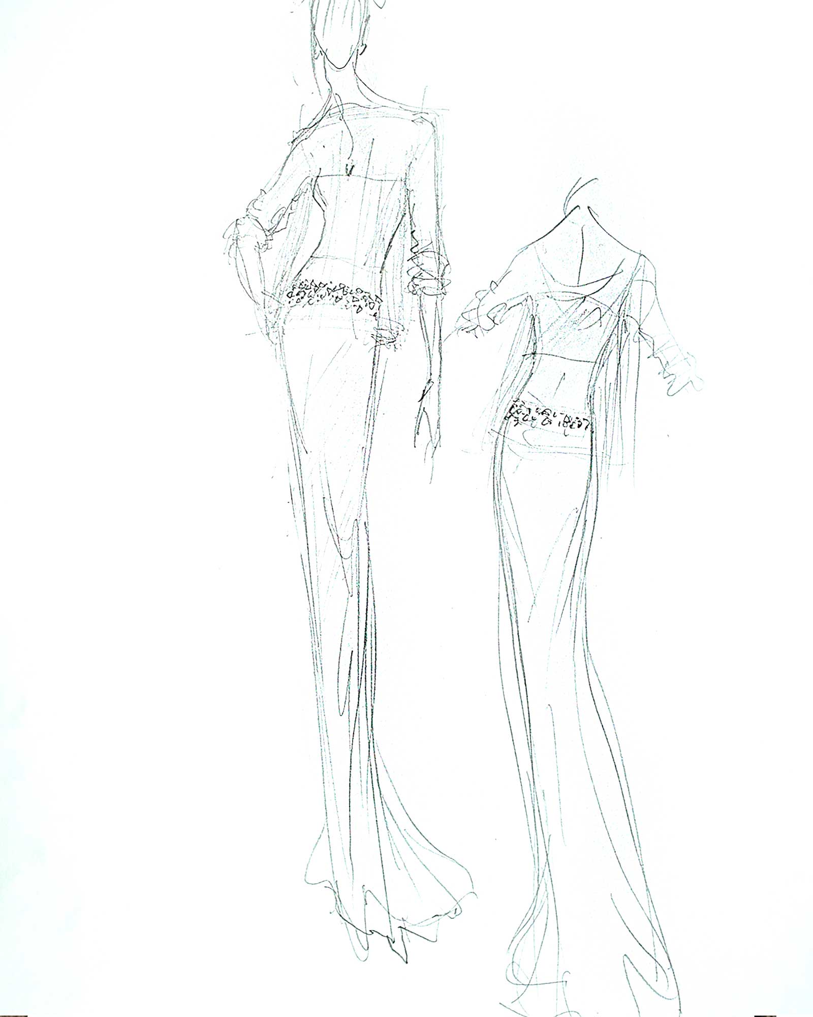 While we’ve known Vania for years, this was our first time working with Inno Sotto. Being able to work with him was such a pinch-me moment, to be honest. It really felt like the stars aligned for us; having him onboard made an already special moment feel extra special. For Inno, I requested a more streamlined silhouette, and this ensemble is his relaxed take on red-carpet dressing. I love the subtle details that went into making this: From Inno choosing fabric that’s wrinkle-resistant so it’ll survive the long travel and the irregular noir stone embellishments on the skirt’s waistband—only visible through the sheer knit top—to the beautiful draping at the back, these nuances really lend an effortless grace to the look. To add some color and sparkle, I styled the outfit with a pair of geometric radiant-cut yellow diamond drop earrings from JMA Jewelry.