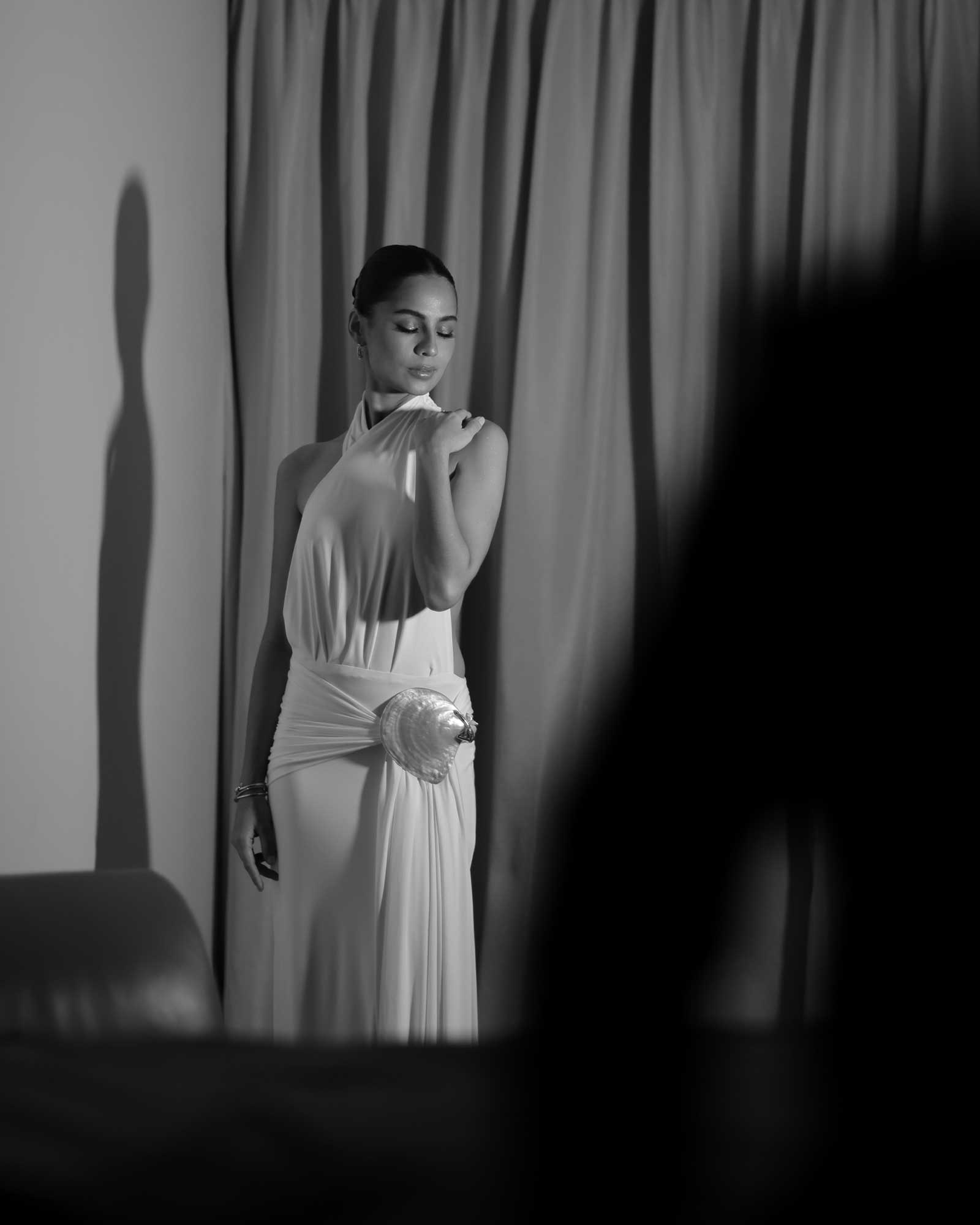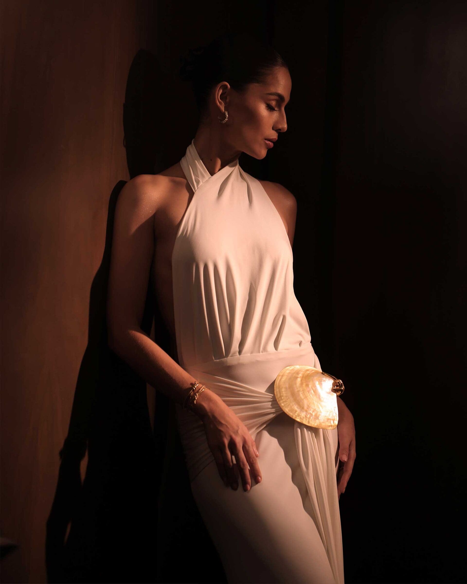 For this vision, she turns to designers Martin Bautista and Neil Felipp, who have collaborated to create the actress’ dress for the gala. The color palette is timeless: classic white and gold. Echoing the elegance of ancient Greek sculptures, the white fabric seamlessly contours her form. It also embodies the essence of a siren and pays homage to Bautista’s previous collection with a Siren Shell from Cebu.