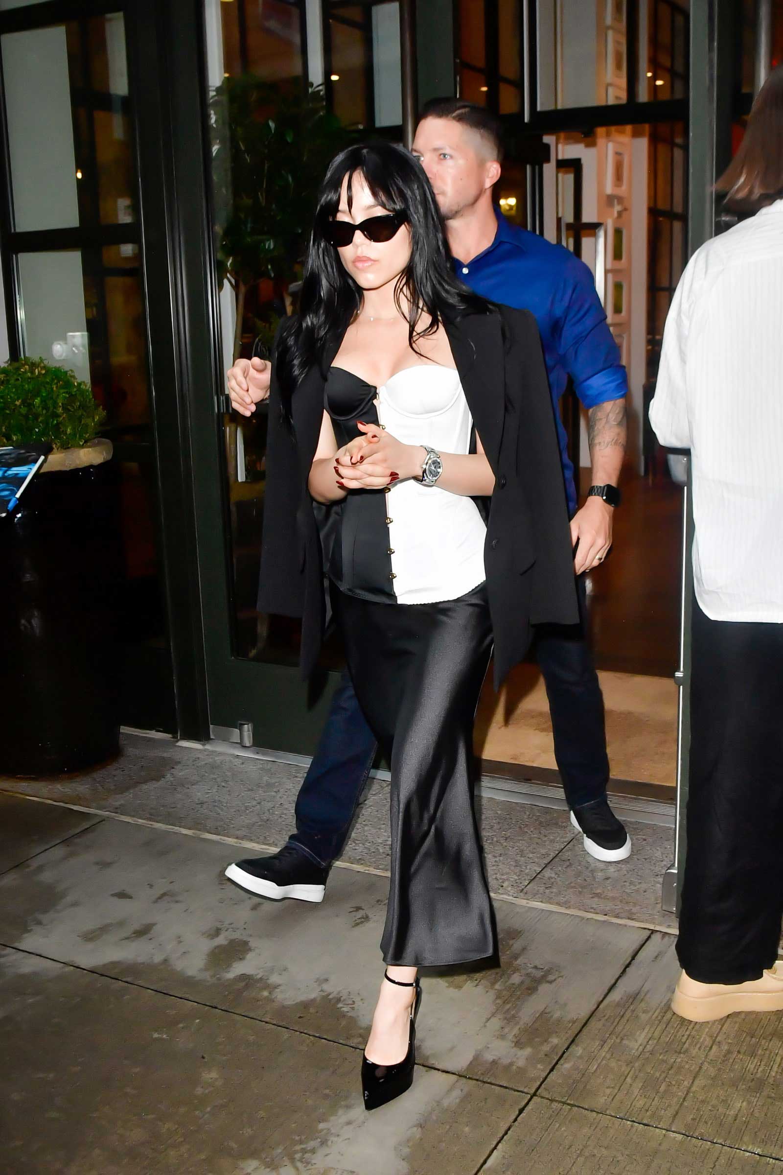 Even Ortega’s more casual off-duty looks have struck the right style chords. She emerged in New York wearing a white button-up, cropped leather bra top, and a black mini skirt; The star also donned a two-tone white and black Agent Provocateur corset with a chic black silk skirt.