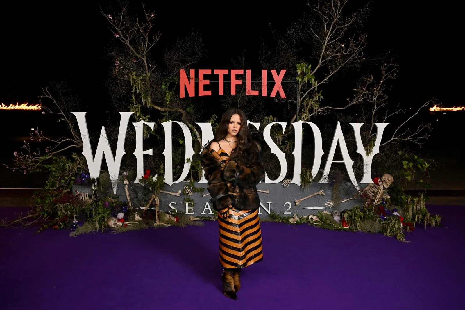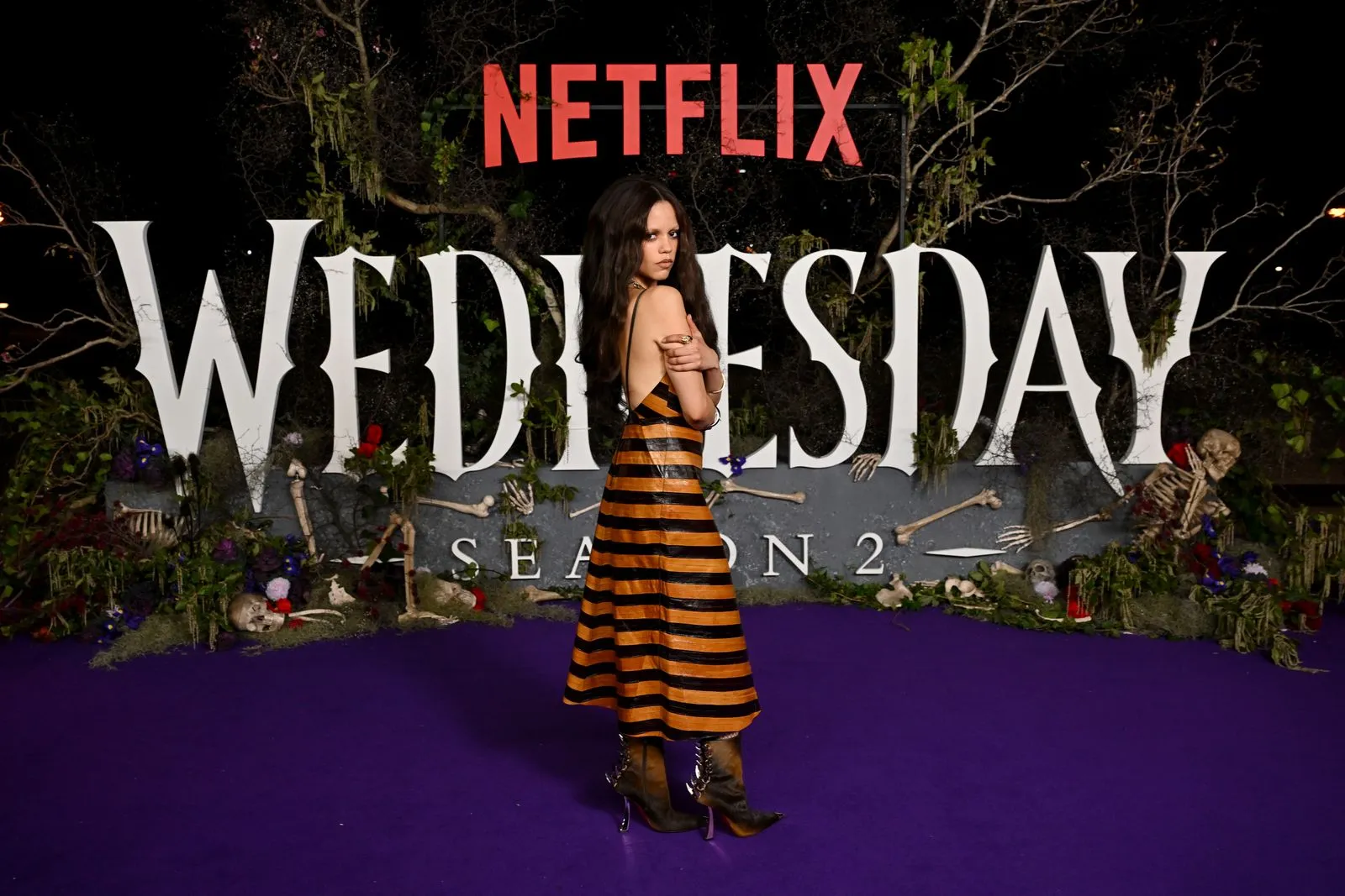 Her latest look is less Wednesday Addams, more Beetlejuice (Beetlejuice! Beetlejuice!). Photographed at a fan event on Cockatoo Island in Sydney, Australia, Ortega wore a leather, pumpkin orange and black striped Fendi dress.