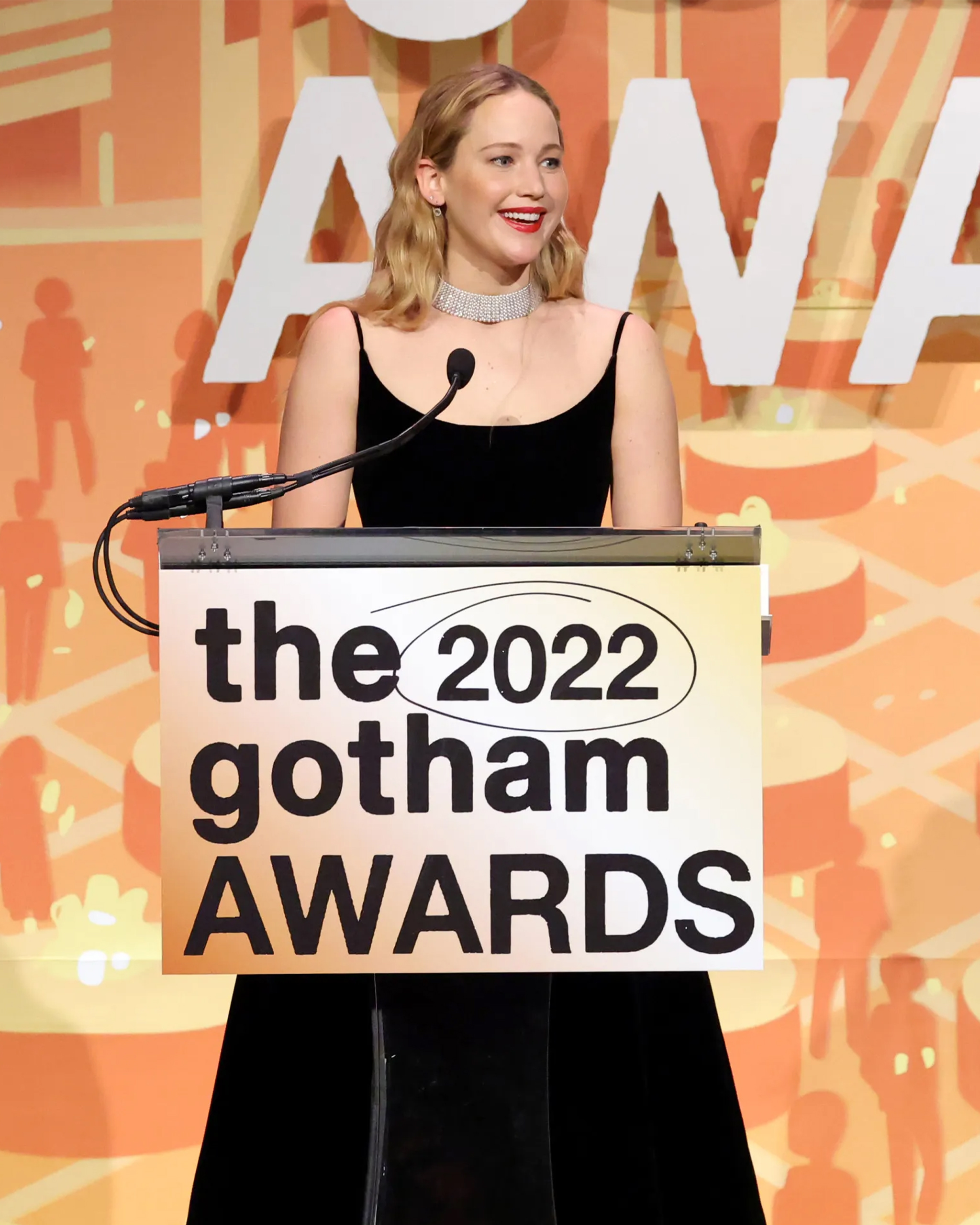 While her Manhattan style is distinctly relaxed, Lawrence served Old Hollywood glamour in her sculptural dress—which she accessorized with a diamond choker and red lipstick—as she presented the Best Feature award.