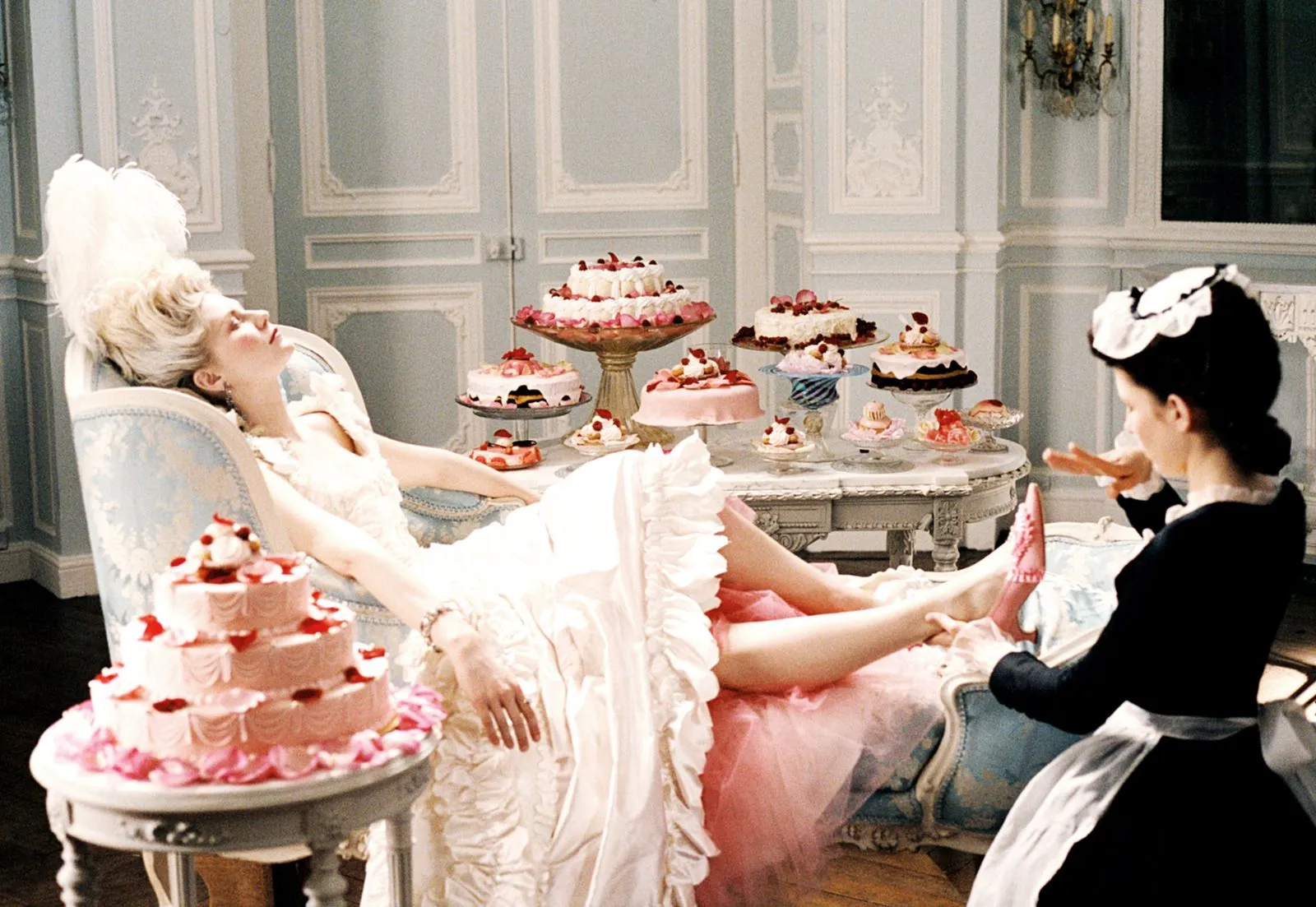 A mirror to the young queen’s lavish lifestyle at Versailles, the decadent dress—designed by Milena Canonero and reproduced by Tirelli especially for Vogue World Hollywood—takes a “more is more” approach. The cream gown is embellished with ruffles galore—tracing the contours of the bodice and skirt, not to mention its diaphanous frilly sleeves. Underneath the skirt is a layer of pink tulle, helping to give the dress its shape and adding a whimsical pop of color, seen in the film when Marie lies in repose, surrounded by plates of desserts, her shoe slipped onto her foot by a maid.