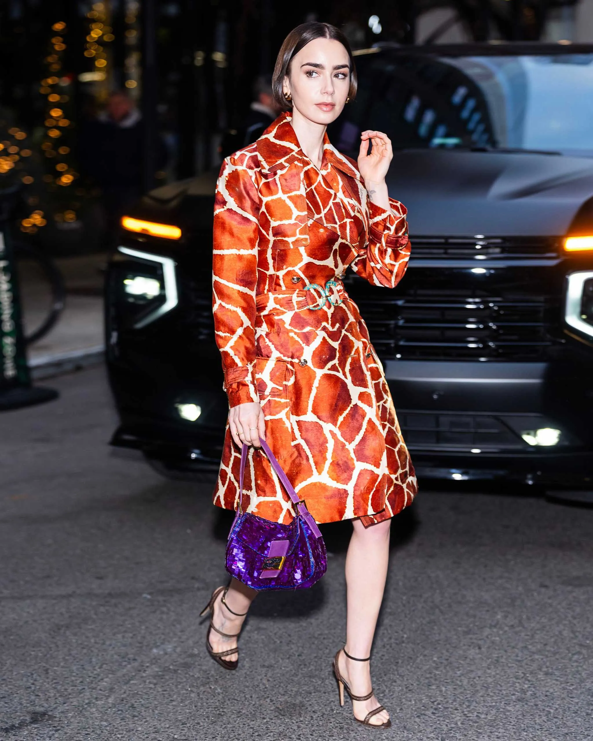 Off-duty, the actor can be found in statement outerwear and tomboyish button-ups and trousers. But today, Collins continued promoting the forthcoming season of Emily In Paris, dressed in her character’s signature maximalism: a burnt orange silk giraffe print Roberto Cavalli coatdress, a pair of brown strappy Giuseppe Zanotti stilettos, and a purple sequined Fendi baguette.