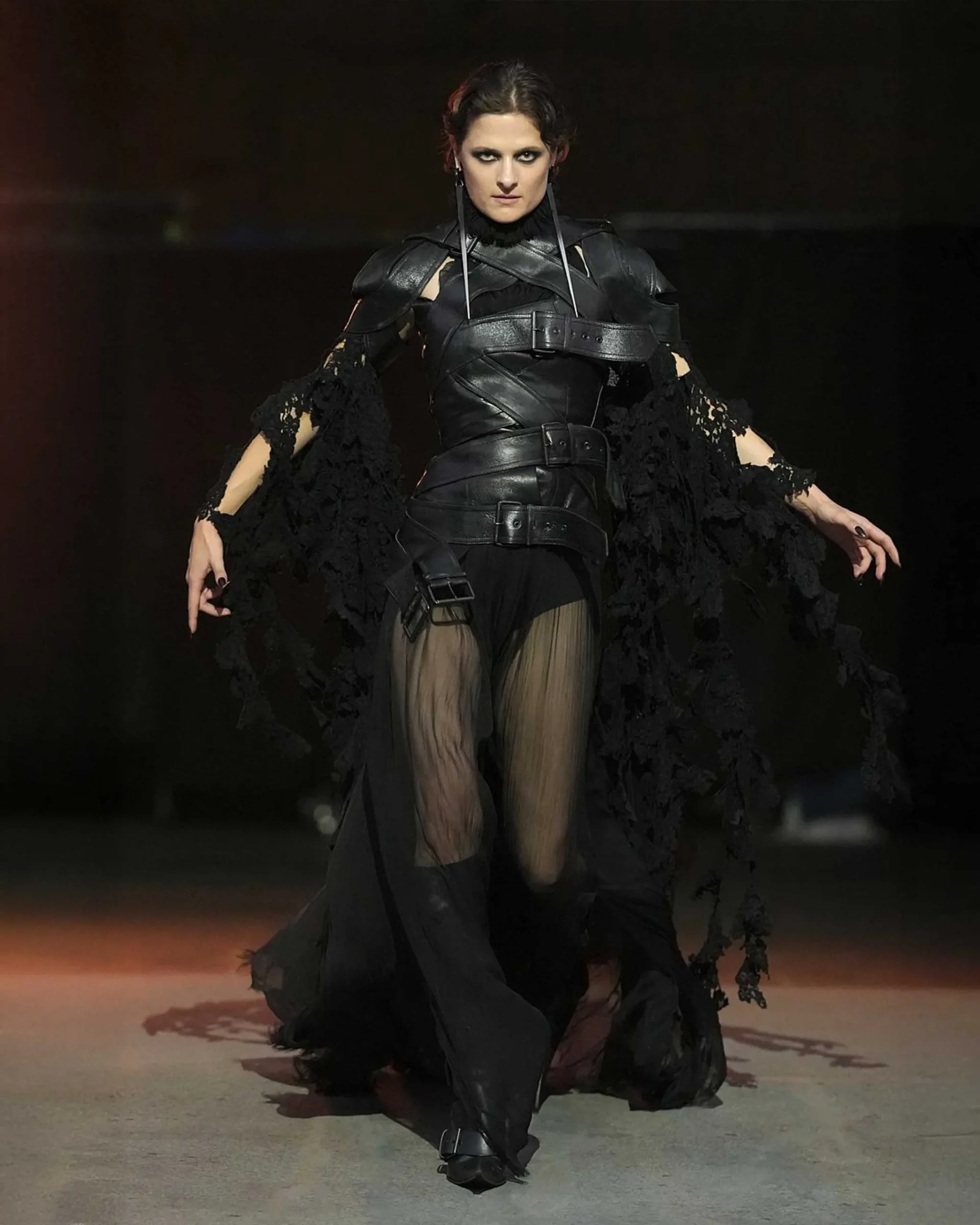 McGirr, for his part, added his signature gothic glamour. Playing off of the original costume’s hardware and leather, McQueen created a black leather bodice outfitted with criss-crossing leather belts. Underneath, a more romantic interpretation: a high neck, reminiscent of the Victorian collars from fall 2025, black lace sleeves emerging from beneath the leather, tendrils hanging down to floor, and a gauzy, sheer black shirt.