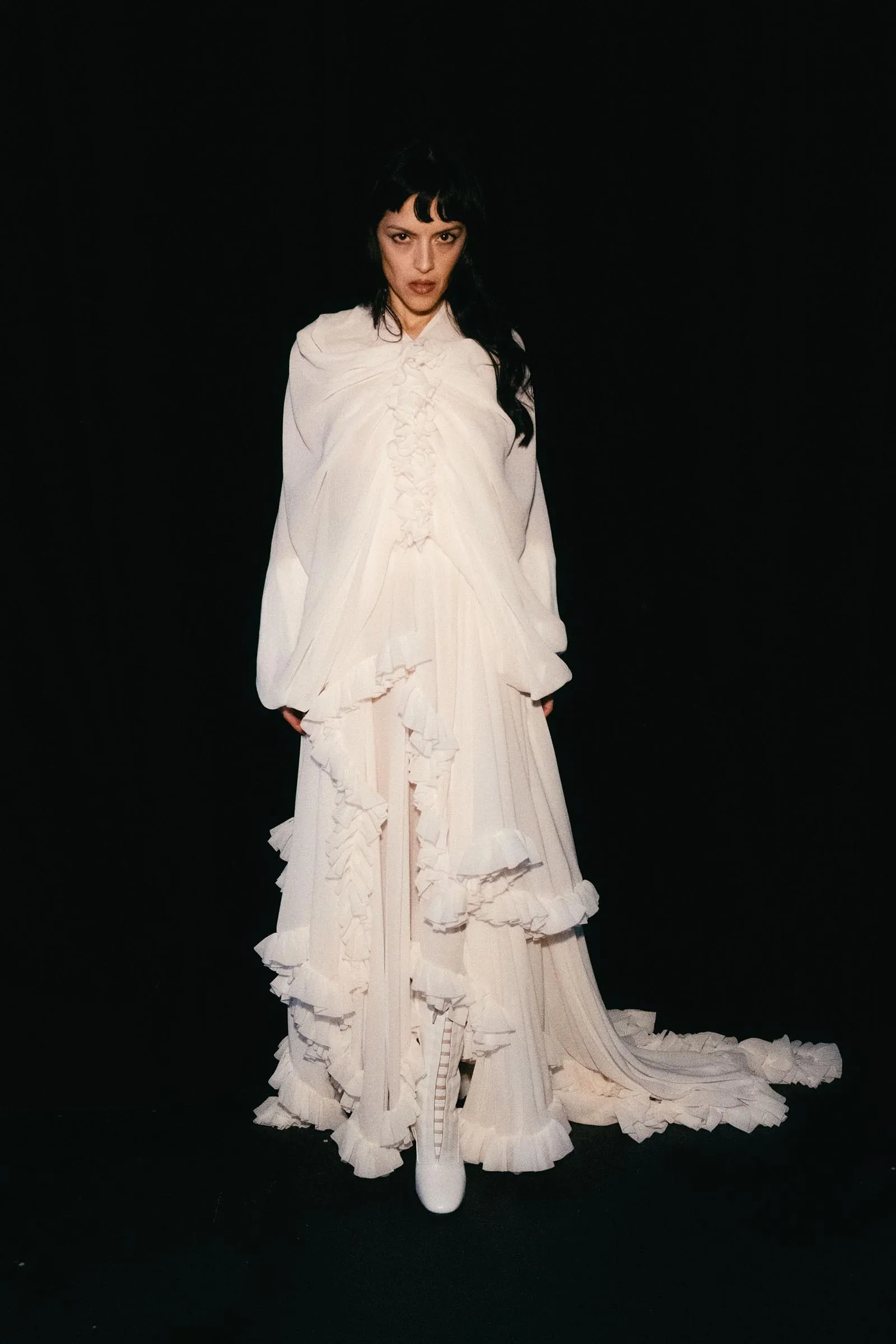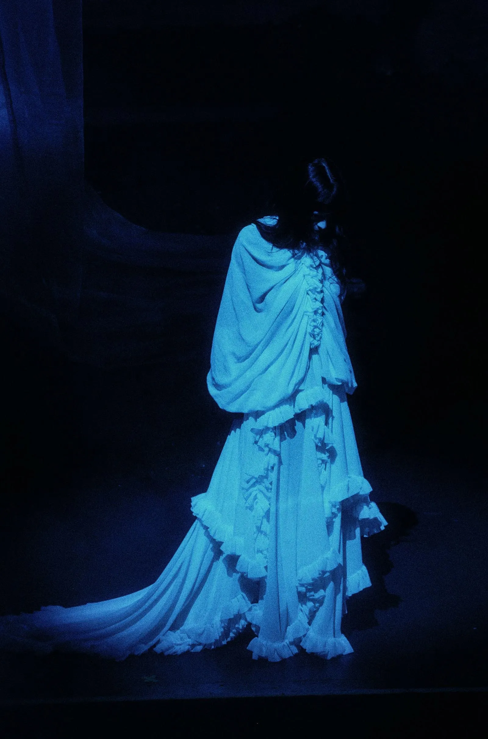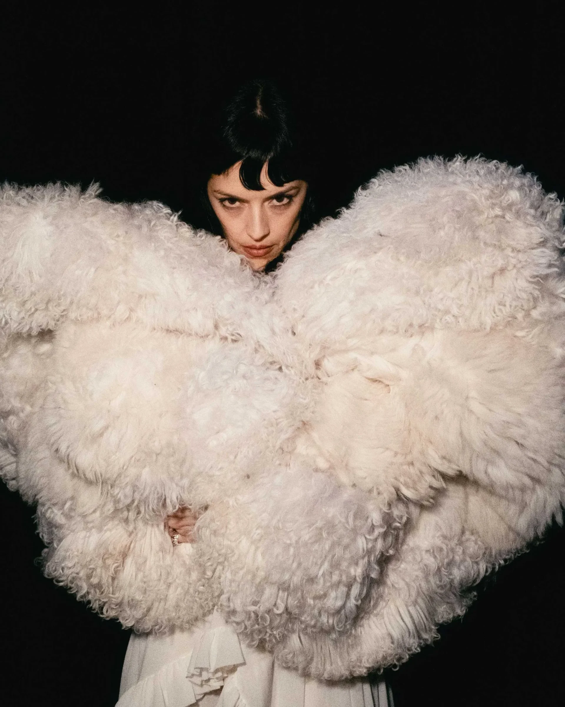 Zardoya, styled by Jose Carayol, turned to McQueen to bring her dark, balletic fantasy to life, hitting the stage in a voluminous feathered jacket over an organic, wispy dress with a dramatic ruffled train. “I was also drawn to looks that could be shed throughout the show, allowing them to evolve in real time and mirror the transformation taking place on stage,” she says. “McQueen was the perfect house to dress this tour. They understand the beauty of drawing from nature and the underworld and how to translate those worlds into texture, shape, and movement.” Zardoya was also touched by a thematic connection: “I’ve always loved that McQueen had a fascination with birds, so there truly was no one more fitting to transform me into a swan.”