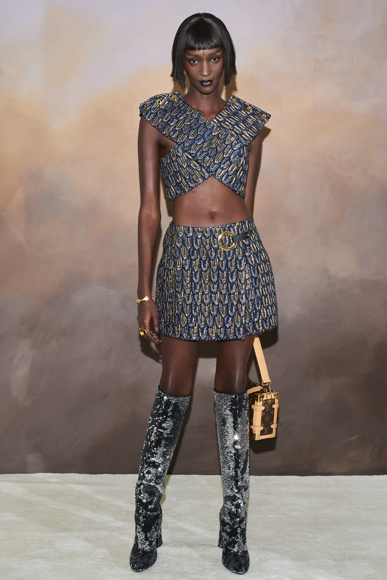 Lous and the Yakuza’s look took on a modern approach to the occasion. With a midriff-baring silhouette, the sleek separates were elegant yet streamlined. Paired with sequin-filled thigh-high boots, the Congolese-Belgian singer brought a shimmering touch to her evening look.