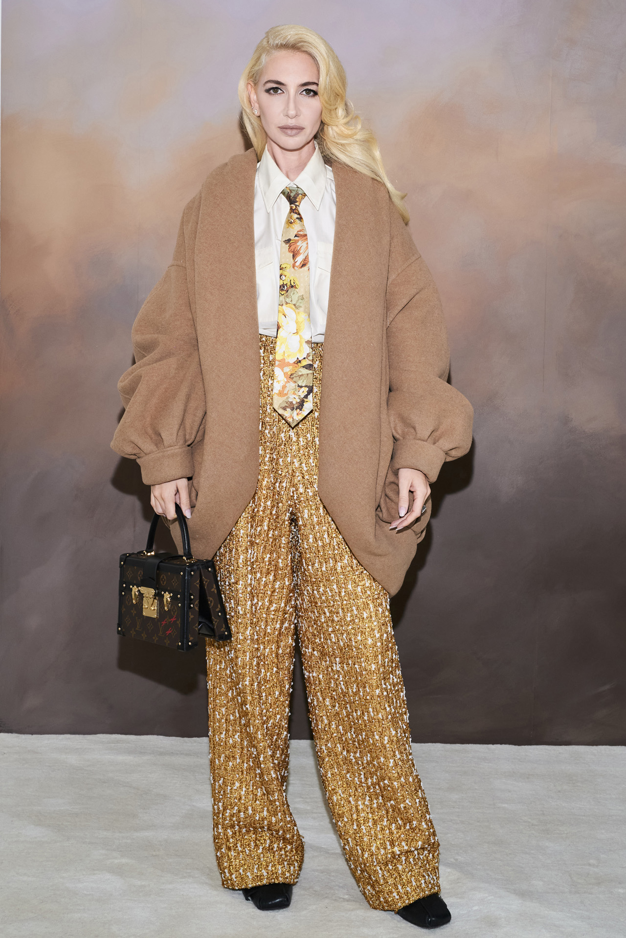 Scholastic sophistication makes an entrance with Sabine Getty’s ensemble. Tweed pants, a camel-toned overcoat, a floral tie, and a white button-up come together for a fabulously fun update to anAnnie Hall-approved ensemble.