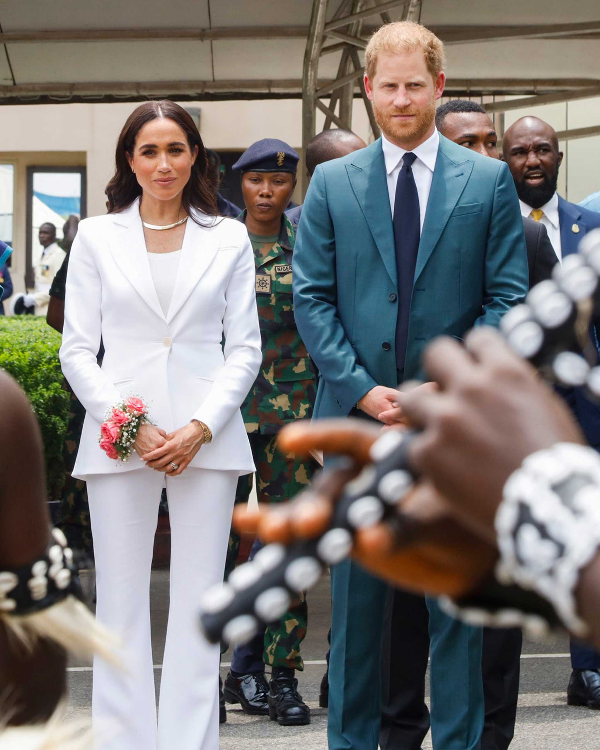 For their second engagement on Friday, on the other hand, Harry and Meghan made it clear that, while they may no longer be senior “working” royals, they haven’t forgotten the etiquette drilled into them when dispatched to Australia, Fiji, Tonga, and New Zealand by the late Queen in the wake of their 2018 wedding. Although it’s traditionally left to female members of the royal family to pay tribute to their host country, the Sussexes delivered a fashion double act: the Duchess slipped into a snow-white Altuzarra suit (first worn in Sydney during her pregnancy with Archie), while the Duke appeared in teal-green tailoring, comprising a joint nod to the colors of the Nigerian flag.
