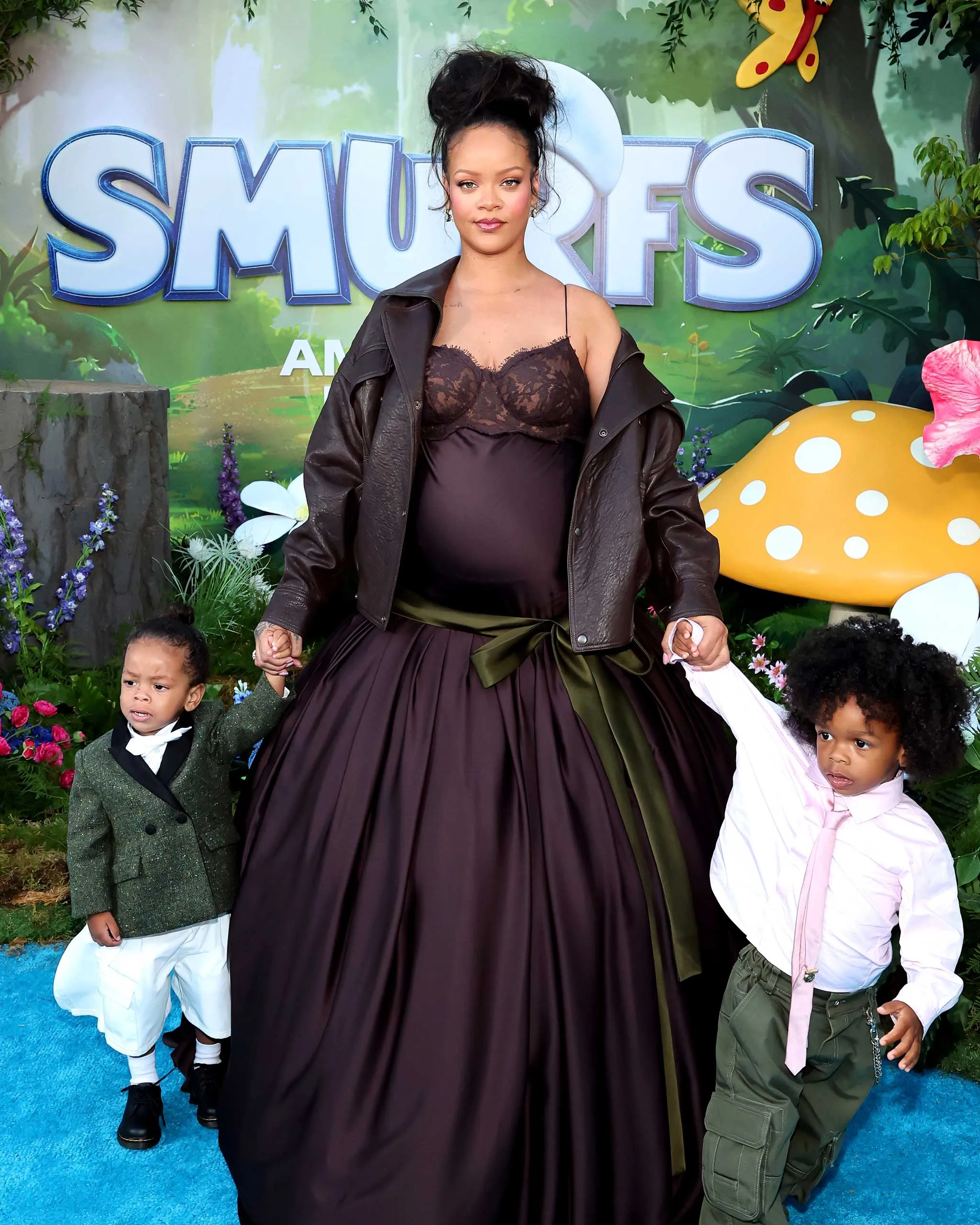 Pregnant with her third child (a wordless announcement was made on the Met Gala steps in custom Marc Jacobs tailoring), Rihanna hit the LA premiere of The Smurfs in a Saint Laurent autumn/winter 2025 gown that ticked every box of her signature maternity style: lingerie-inspired and statement-making, with a biker jacket thrown in for good measure. Perhaps the biggest fashion flex of all? Her sons RZA and Riot joined her on the red carpet, dressed in mini custom Dior by Jonathan Anderson, fresh from his debut runway show for the French house.