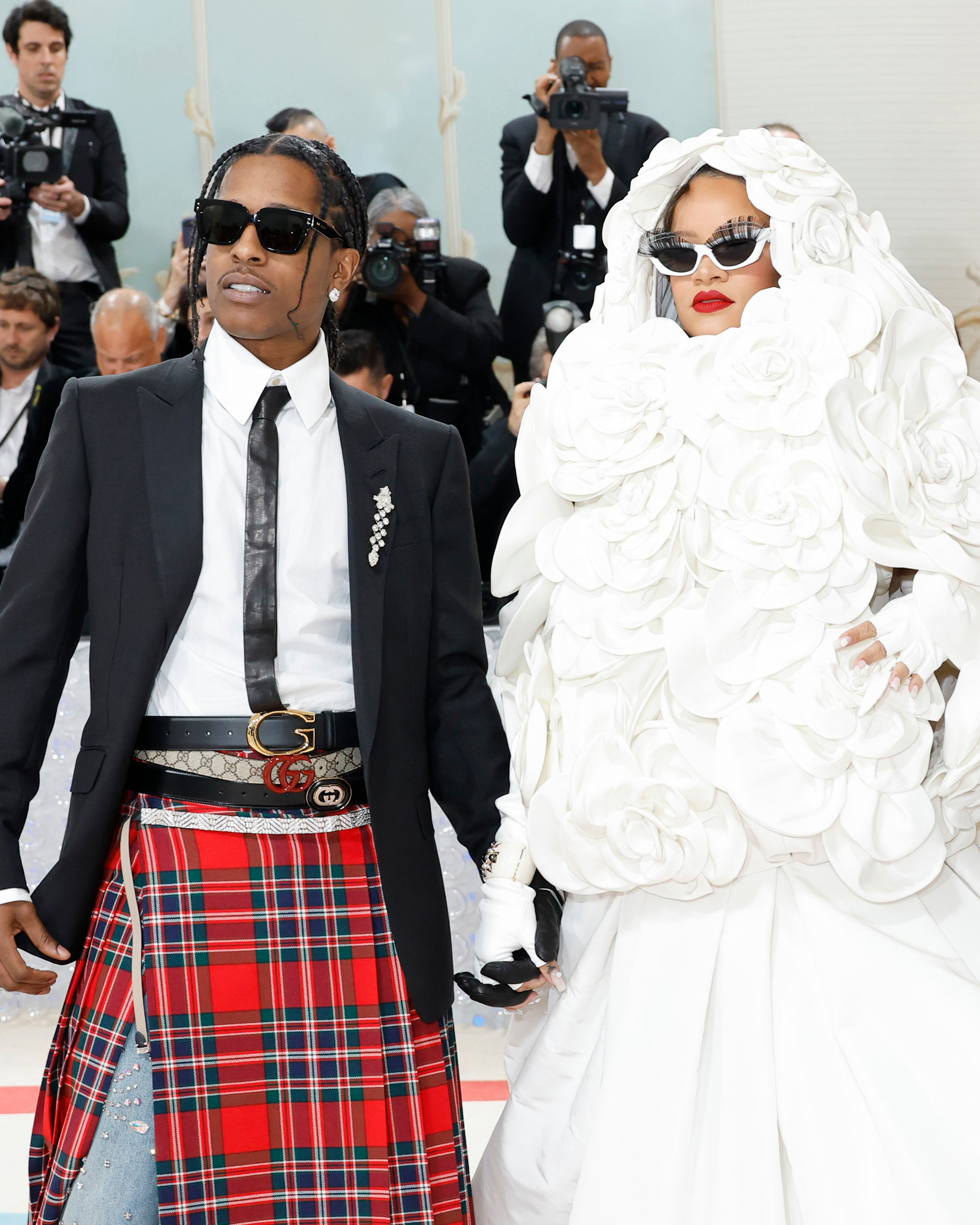 Lagerfeld was known for his long-standing love of Scotland, and wore a similar skirt on the runway of a 2004 Chanel show in Tokyo. Much like his partner, Rocky made sure to give the look an update fitting 2023: namely, stacked Gucci belts and diamanté-studded jeans.