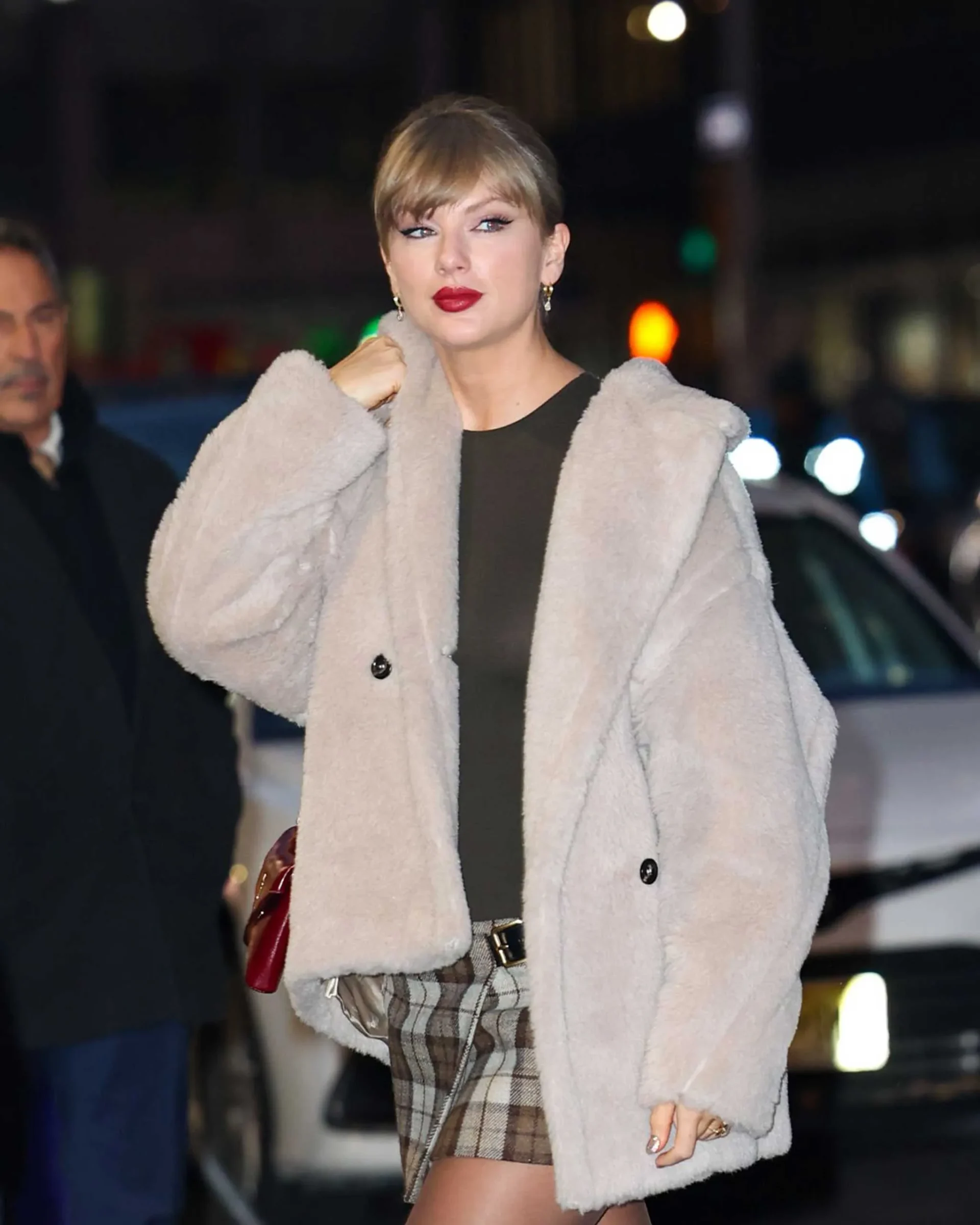 On Wednesday, the singer arrived at The Late Show with Stephen Colbert in a classic TS outfit: a dove gray Max Mara teddy bear coat with a black shirt, a low-slung brown checked Miu Miu miniskirt (complete with a black leather belt blasp with gold hardware), ultra-sheer black tights, and a pair of knee-high dark brown suede Christian Louboutin boots—the telltale red sole matching Swift’s signature red lipstick.