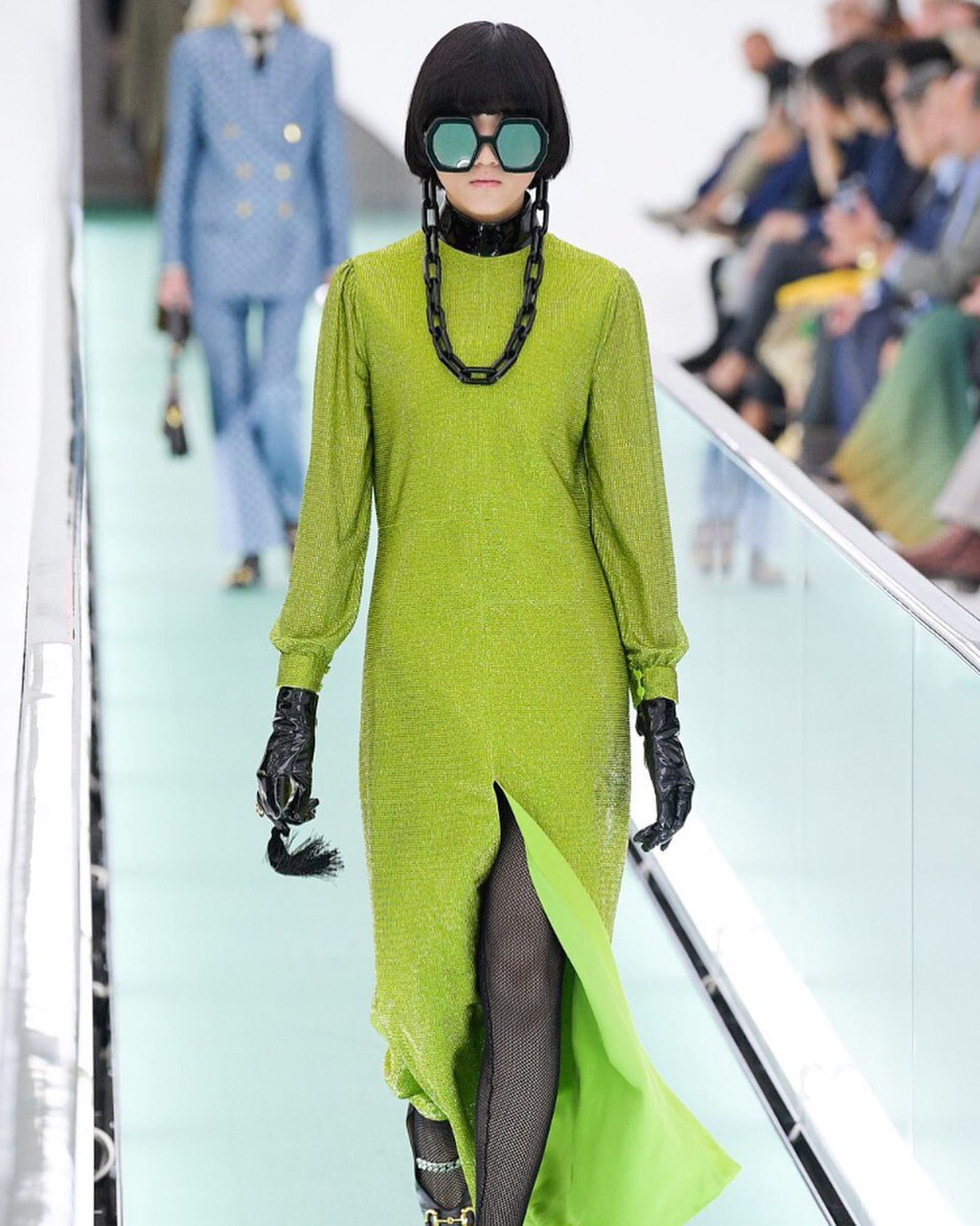 Model Hannah Locsin memorably starred in Michele’s Gucci Beauty Mascara L’Obscur campaign. She made her Milan Fashion Week debut in a shimmering dress in an electric green hue and oversized glasses for Alessandro Michele’s Spring/Summer 2020 collection.