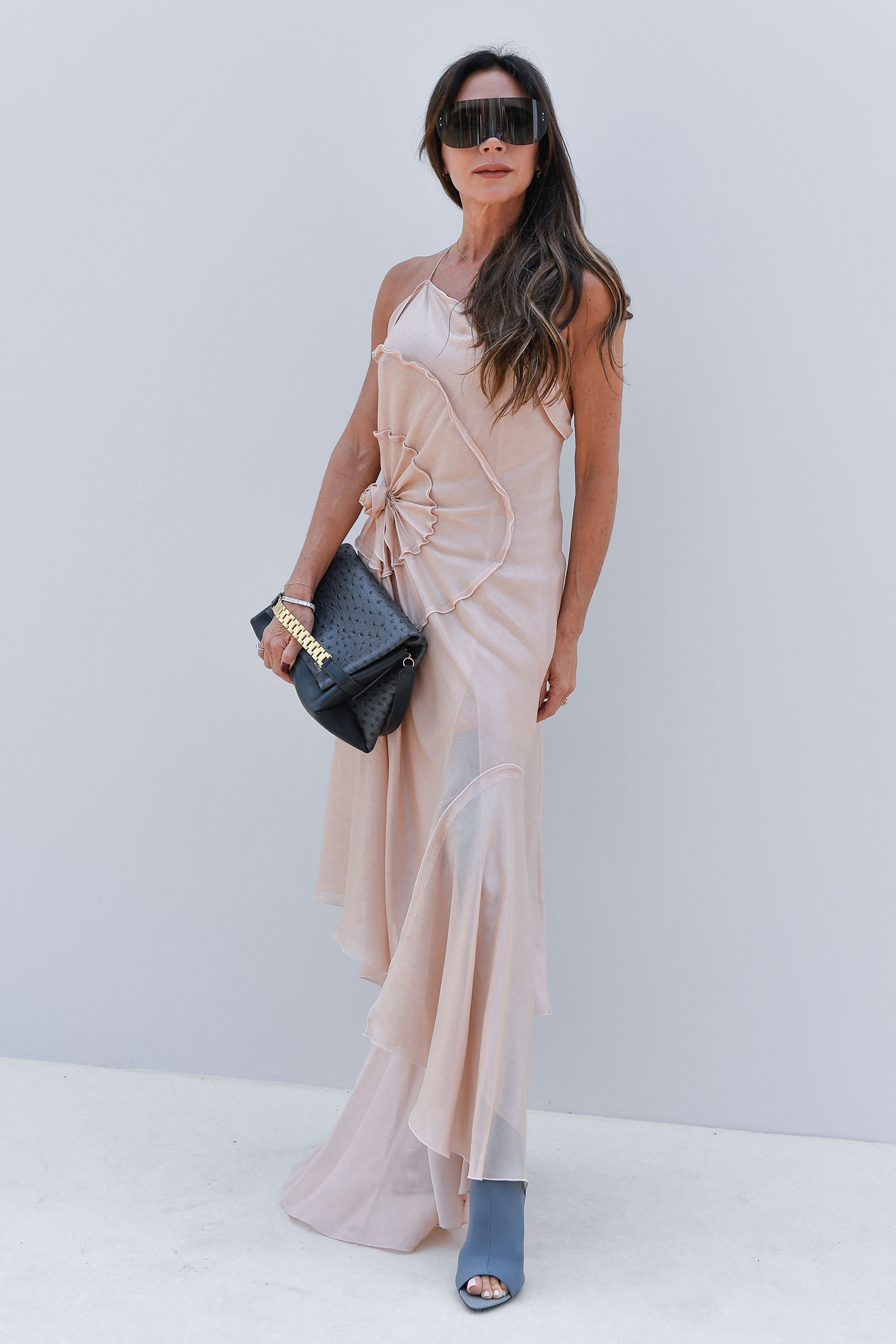 Beckham wore a soft pink slip dress with a flowing asymmetric hemline and dainty spaghetti straps, and a giant ruffled flower adorning her right hip (perhaps a nod to the garden setting). Light and breezy, it was an ideal choice for late June in France. Beckham always puts style over comfort, however, and so instead of an obvious choice like strappy sandals, she wore thigh-high peep toe boots underneath her slip dress (could it be that VB subscribes to the “wrong-shoe theory”?).