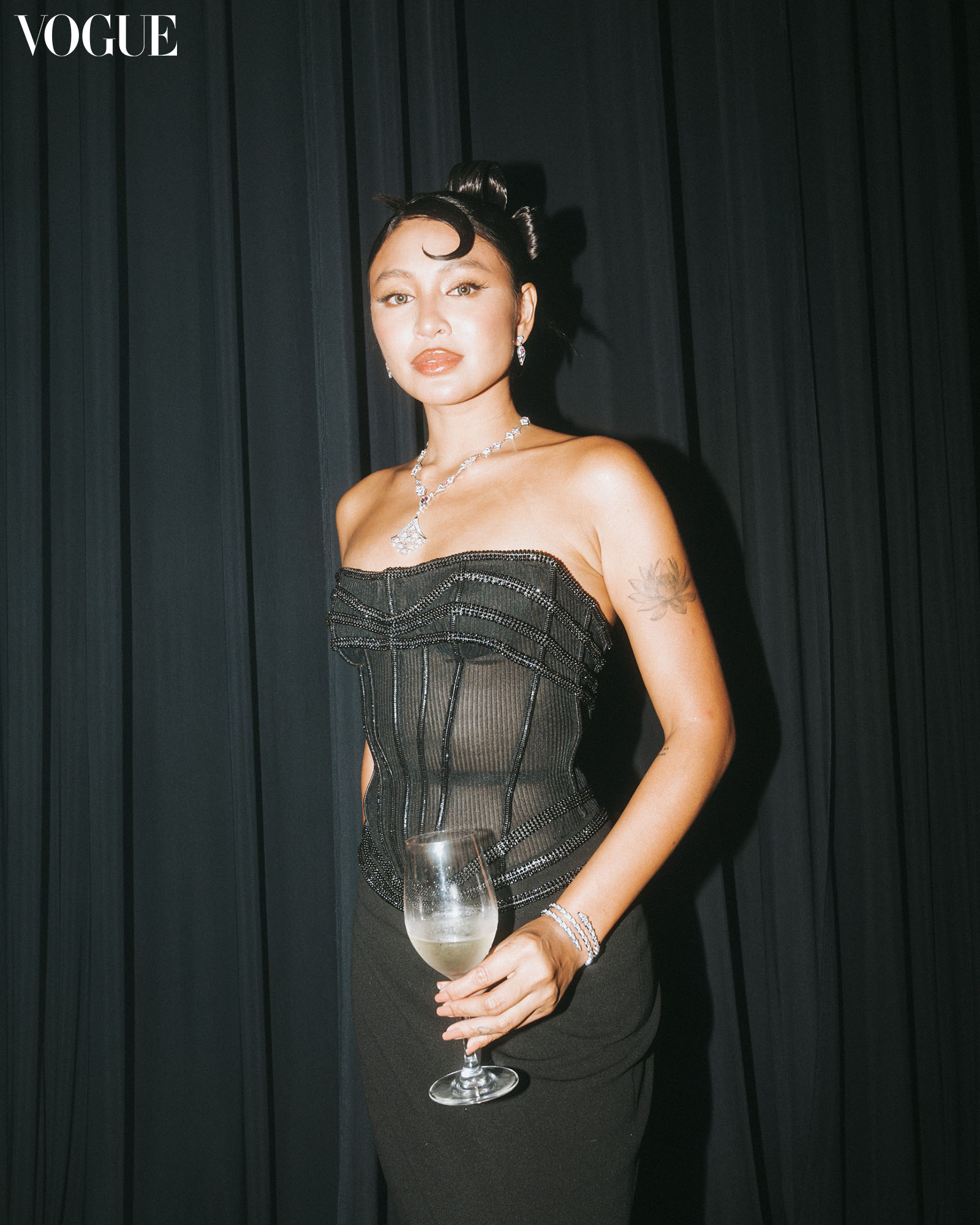 Actress and musician Nadine Lustre described her Vogue Philippines Anniversary Gala look in only two words: “very me.” She wore a nearly-sheer ribbed corseted dress, bustier lined with black rhinestones. A statement necklace and minimal earrings would deliver an elegant balance, with diamonds and pink gemstones set in silver.