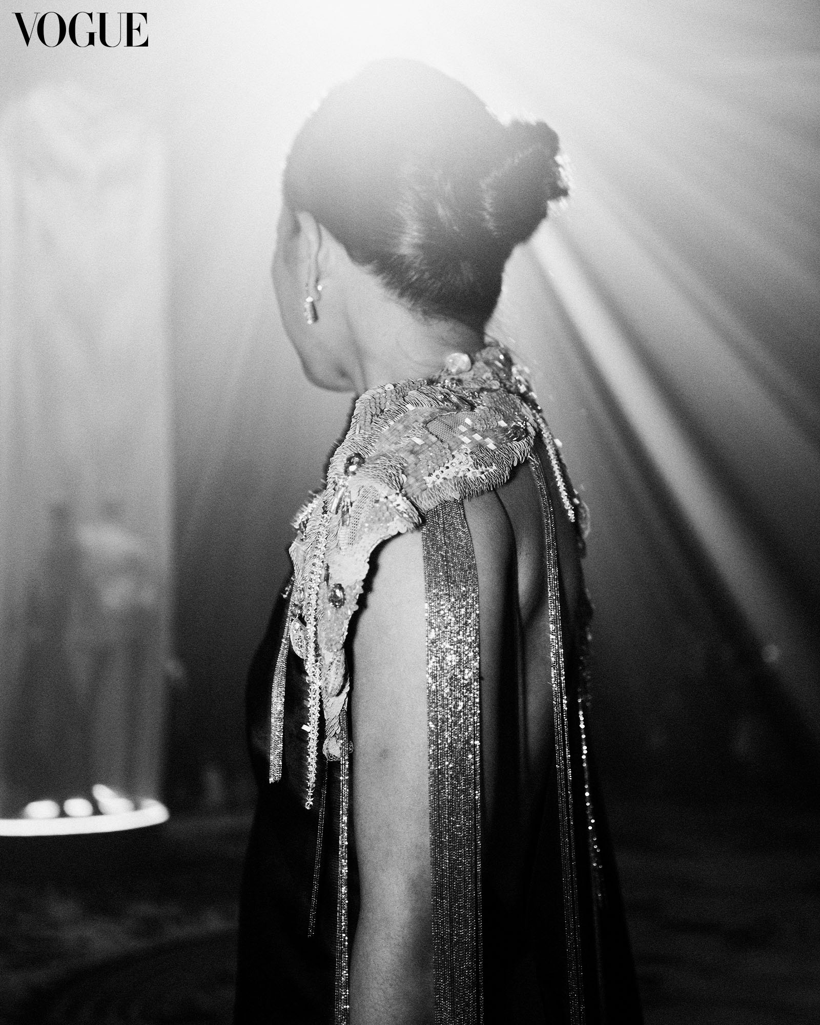 Stylist and creative director Meg Manzano topped a decadent silk one-shoulder gown with what her husband, photographer and Vogue Philippines constant collaborator Artu Nepomuceno, lovingly calls her “armor,” a piece by Valdes Designs that she actually wore on her wedding day. Timeless in its silhouette, it curved organically around her shoulders, patched sequins and trailing crystals catching and reflecting light about her.