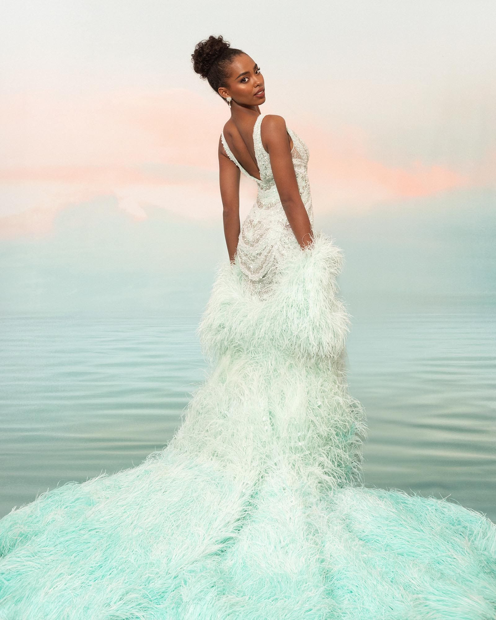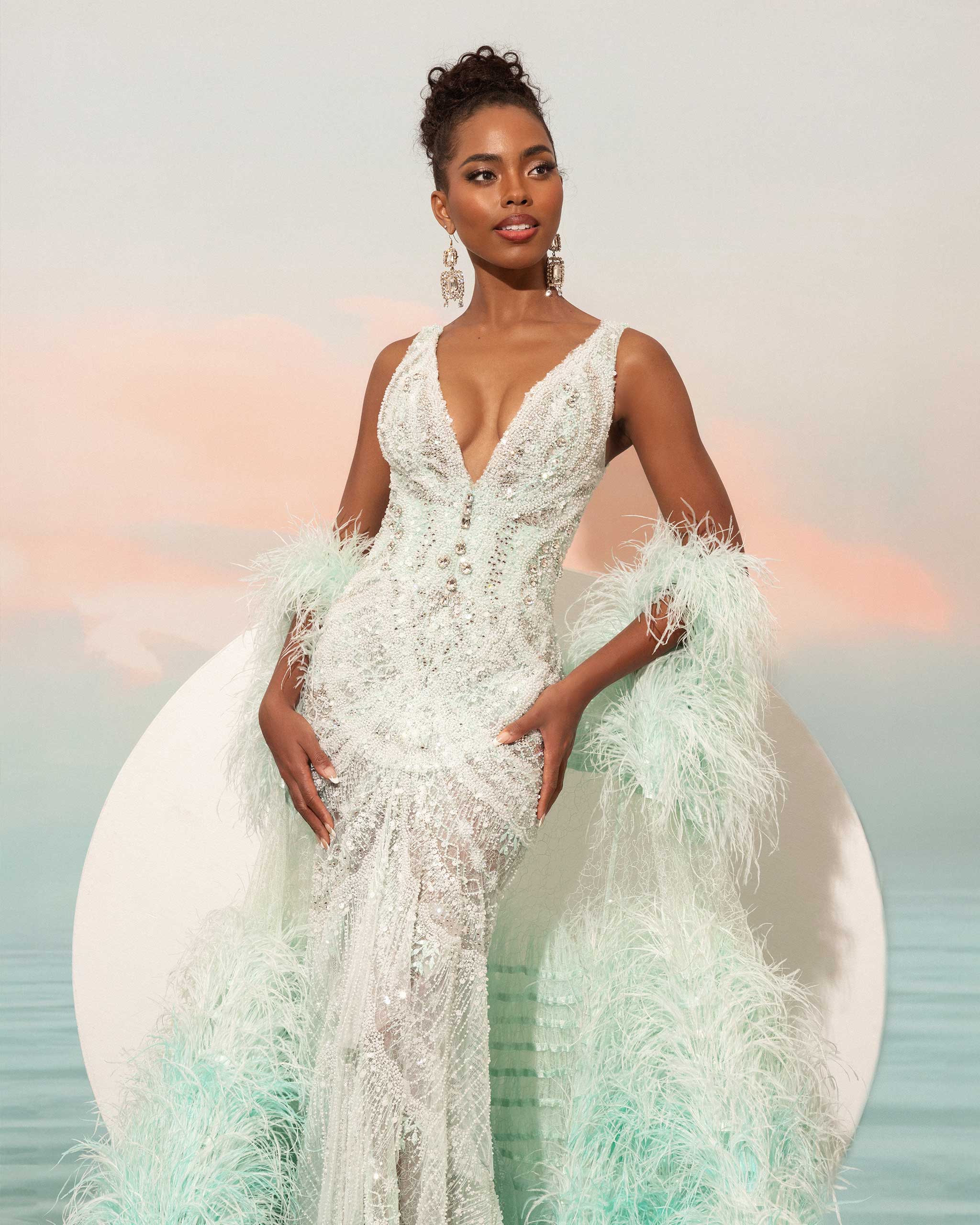 “This Tiffany [blue] gown shows modern glamor meets timeless grace. A statement that our Queen is ready to be seen and will make her mark,” Miss Universe Philippines told Vogue Philippines. “She comes in with a soft armor covered in ostrich feathers ready to unleash what she is authentically made of…. simple yet strong, subtle but remarkable.”