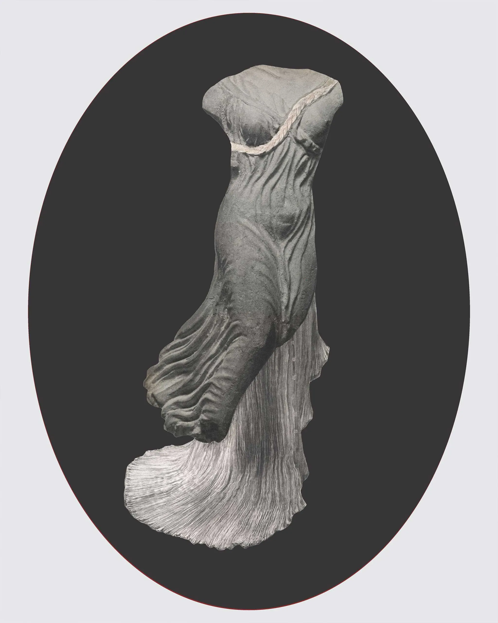 Collage: “Delphos” gown, Fortuny (Italian), Adèle Henriette Elisabeth Nigrin Fortuny and Mariano Fortuny y Madrazo, 1920s. Gift of Frances J. Kiernan, 2005 (2005.328); Terracotta statuette of Nike, the personification of victory, late 5th century BCE. Rogers Fund, 1907 (07.286.23). Artwork by Julie Wolfe. Image courtesy of The Metropolitan Museum of Art