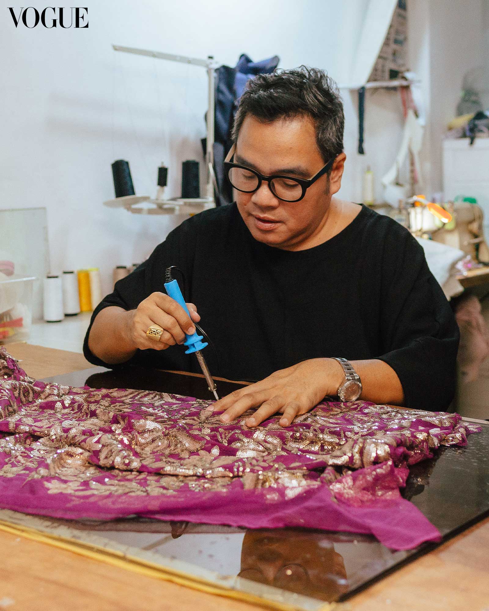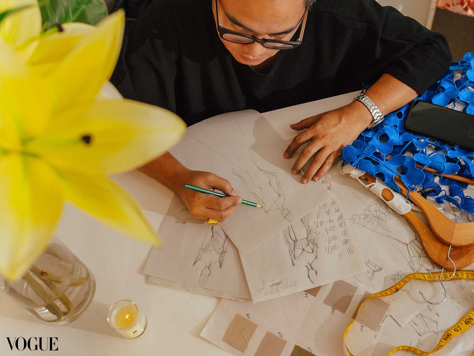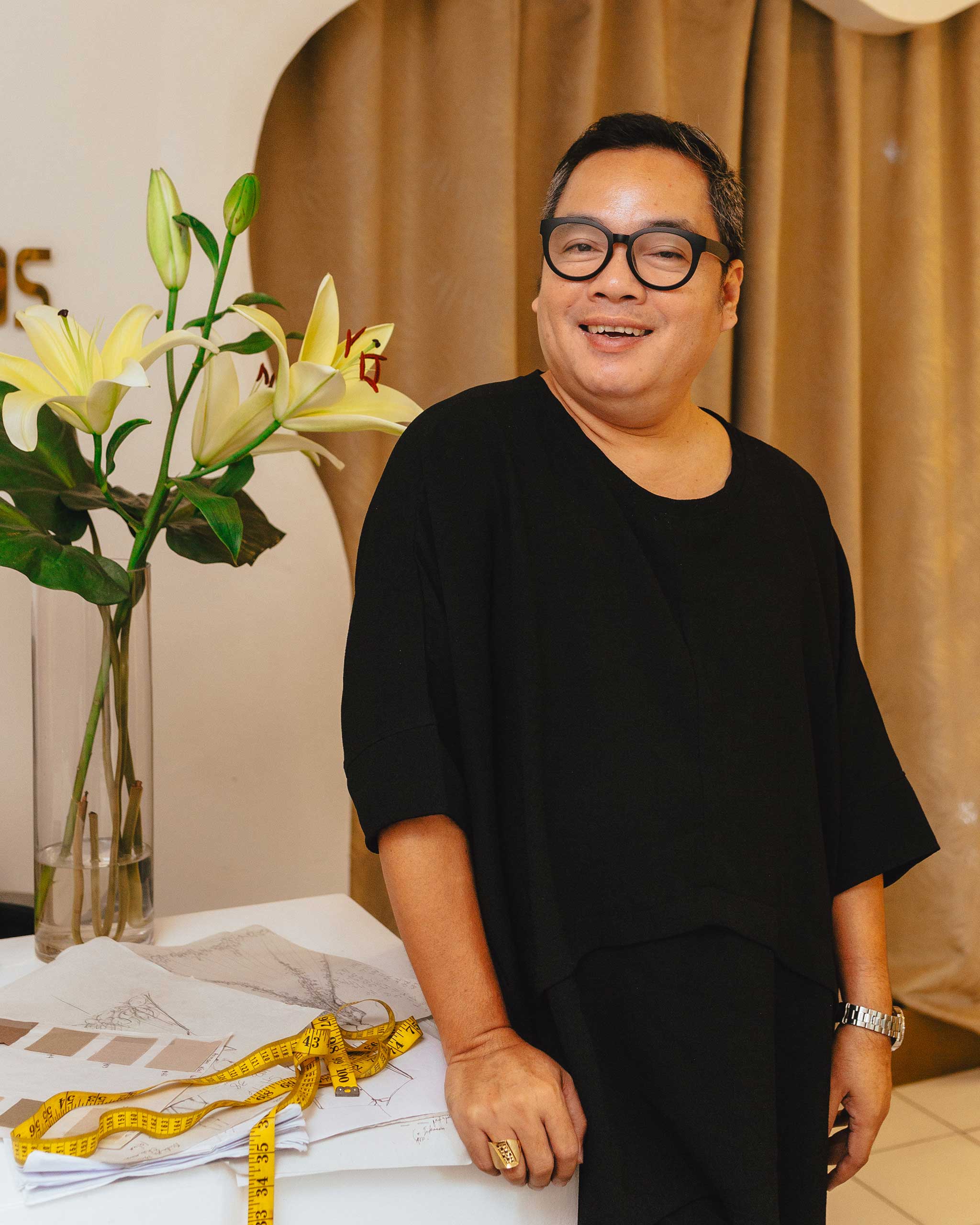 So how does a choreographer find himself creating elaborate fashion collections? Initially pursuing a career in medicine, he found himself designing clothes for friends and acquaintances, igniting his passion for fashion design. “When I went back home to my island province, I opened up a wedding shop. When my customers, who were all my friends and relatives would ask how much I was charging, I would say, ‘okay lang, wala lang.’ (It’s okay, I’m not charging.”) His early works were crafted for personal enjoyment, often using leftover fabrics and experimenting with different styles.