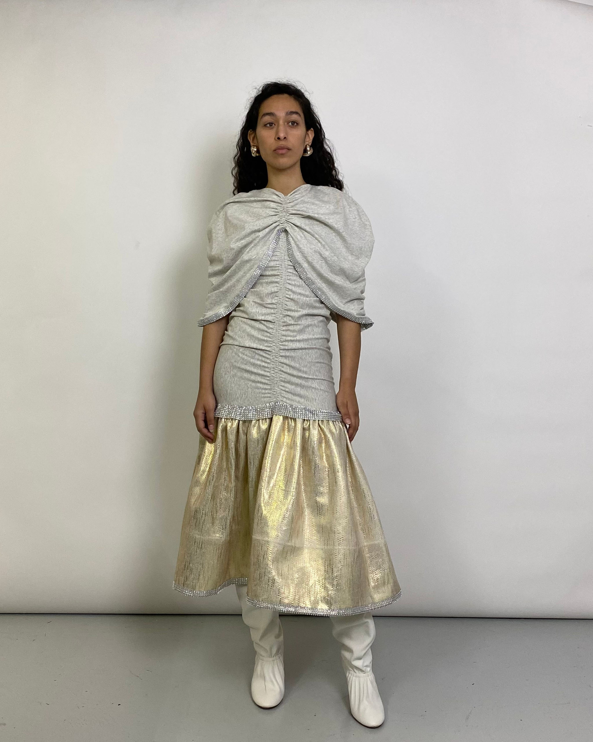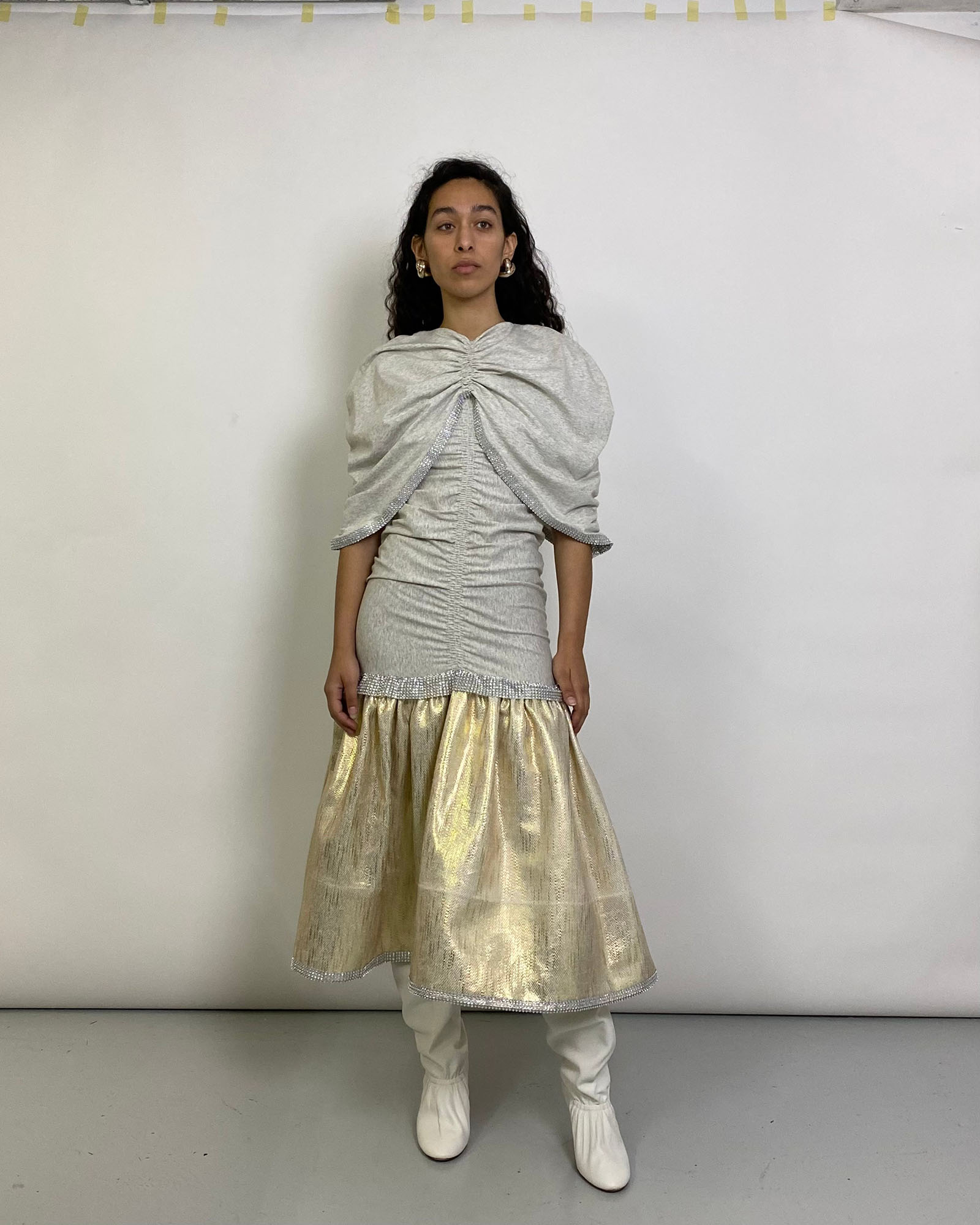 I like to describe my aesthetic as awkward-sophisticated. I think my collections, the garments and also my imagery hold a certain duality in them. An example of this could be a big puffy evening gown-like dress that is made from a basic grey melange stretch-jersey fabric. I like working with contrast!