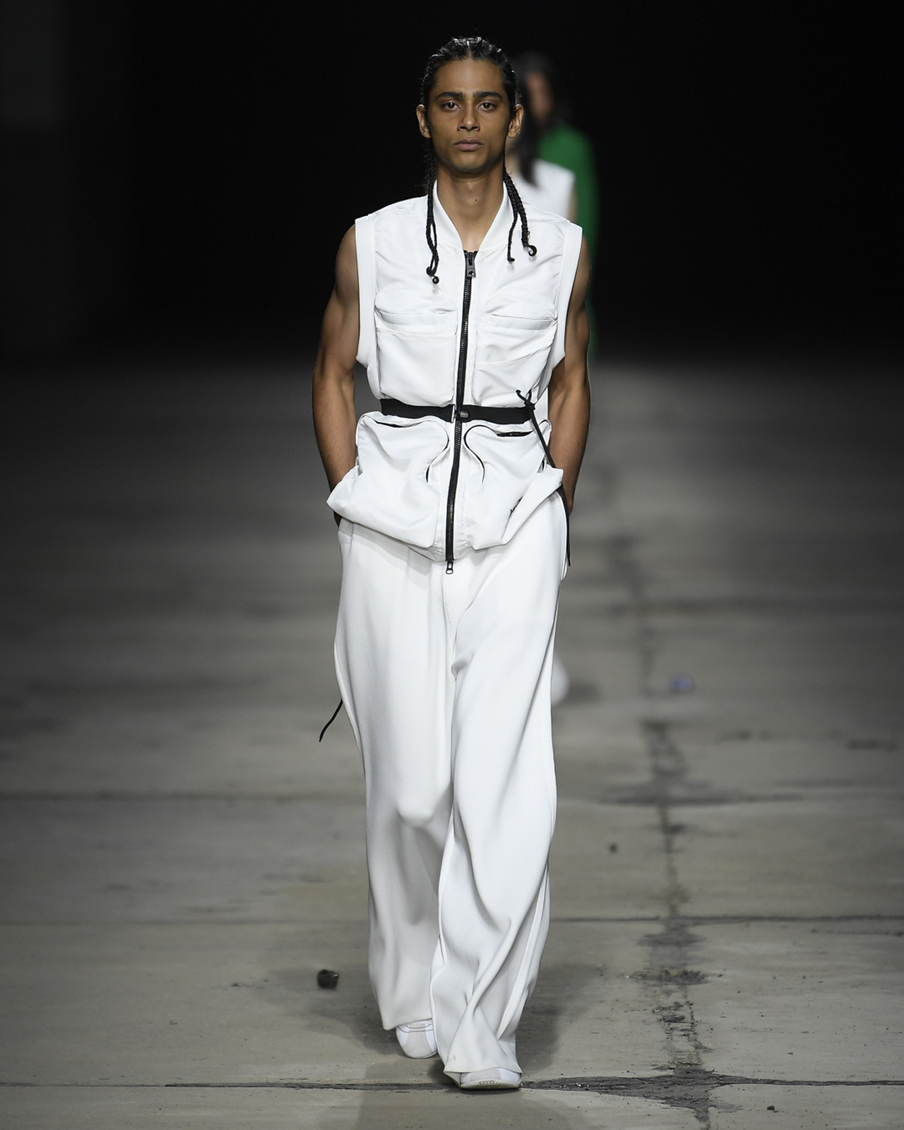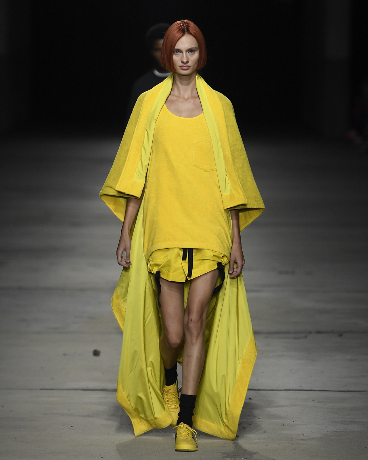 According to the brand’s press release, the collection expressed “the pinnacle of beauty through a subtractive aesthetic that strips away what is not necessary.” By paying tribute to Japanese influences, the Japan-made collection reimagines the concept of simplicity with modern designs. Nylon garments with pleats were reminiscent of the hakama worn by Kyudo archers while kimono references were found within the collection with pieces with wide, billowing sleeves and in the draperies of a beach towel attached to a tank top. Even the vibrancy of Japanese basil leaves were reinterpreted into signature yellow and shiso green creations within the capsule. With fluid silhouettes, designer Andrea Pompilio infused Japanese culture throughout the show.