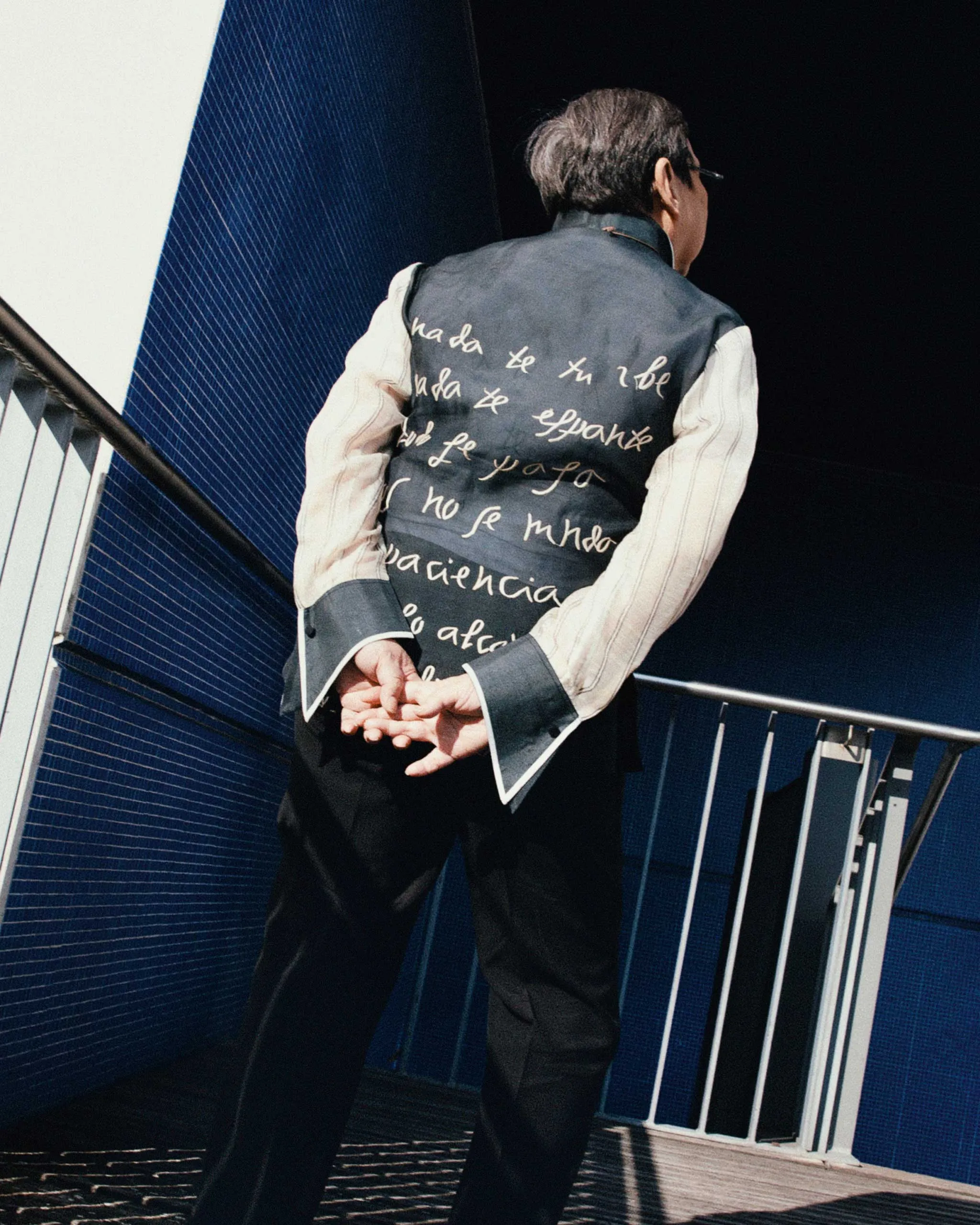 Roy’s custom barongs are all made by Barge Ramos. Embroidered on this one is the Spanish prayer “Nada Te Turbe” or “Let Nothing Disturb You” by Saint Teresa de Ávila, which Roy memorizes by heart and prays daily. Photographed by Max VM for the September Issue 2025 of Vogue Philippines