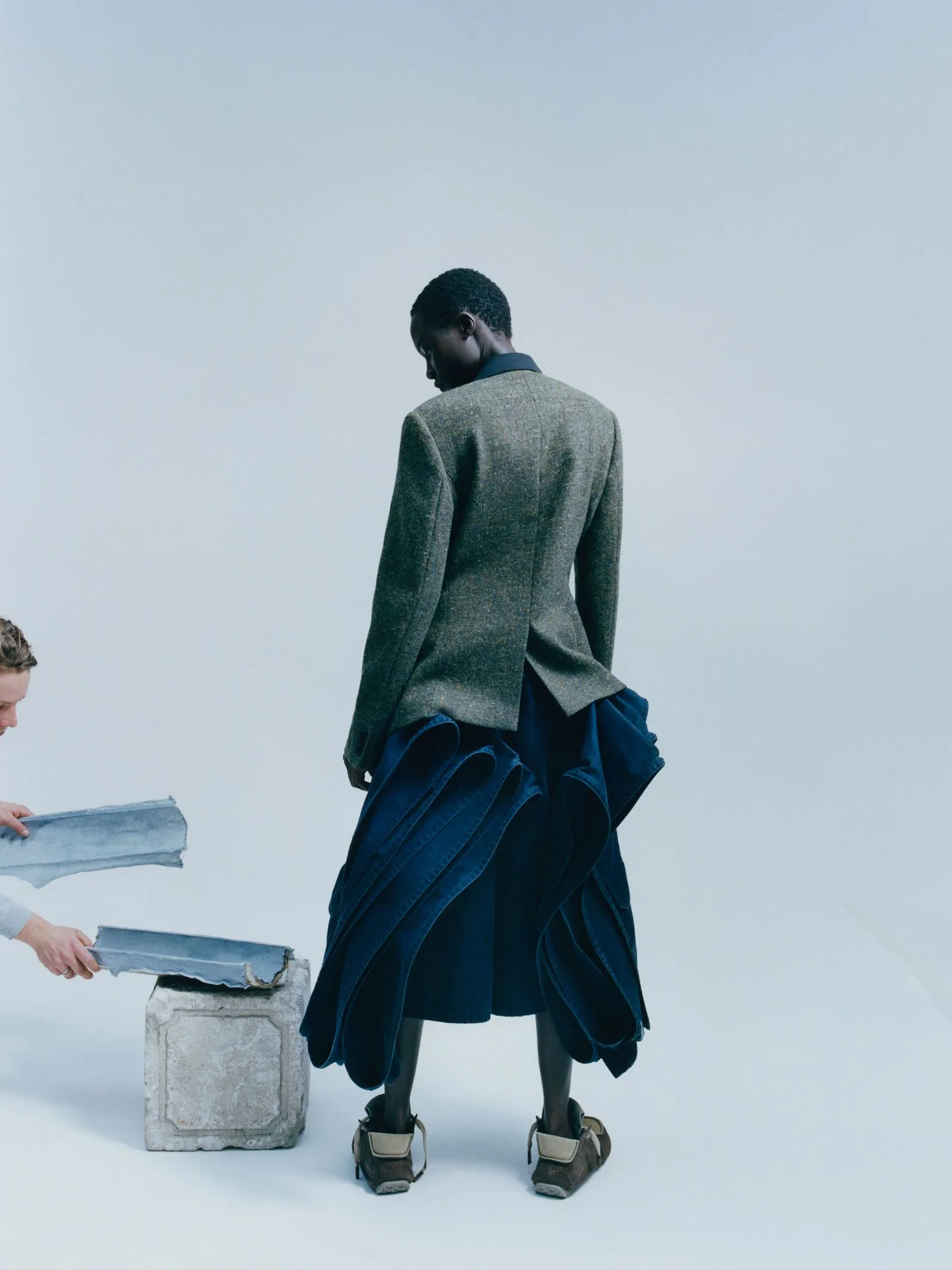 The light outside is pale and fading when, late one Friday afternoon, on a quiet street in Paris, Jonathan Anderson settles at a large table in his office to sift the pieces of the future. “What have we got to go through?” he asks. With an air of surgical focus, his design director, Alberto Dalla Colletta, runs through the day’s couture decision points, then turns to urgencies in women’s ready-to-wear. “This is that skirt we repaired,” he says, riffling through a sheaf of papers. “It’s becoming more of a thing, which I thought was fun.”