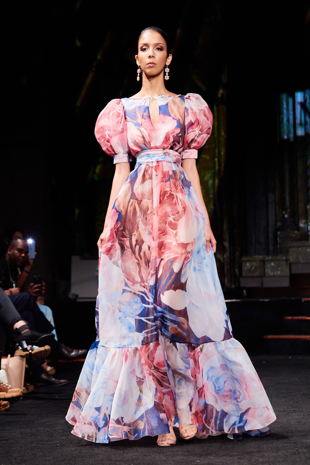 The collection starts with sparkling blue and green dresses and flowing robes and is followed by suits ranging from aquatic hues to flower reds. Afterward, a rush of lively floral day dresses and sheer gowns. For the finale, Cinco reinvents the classic black gown with his signature volumes and hand-embellishments.