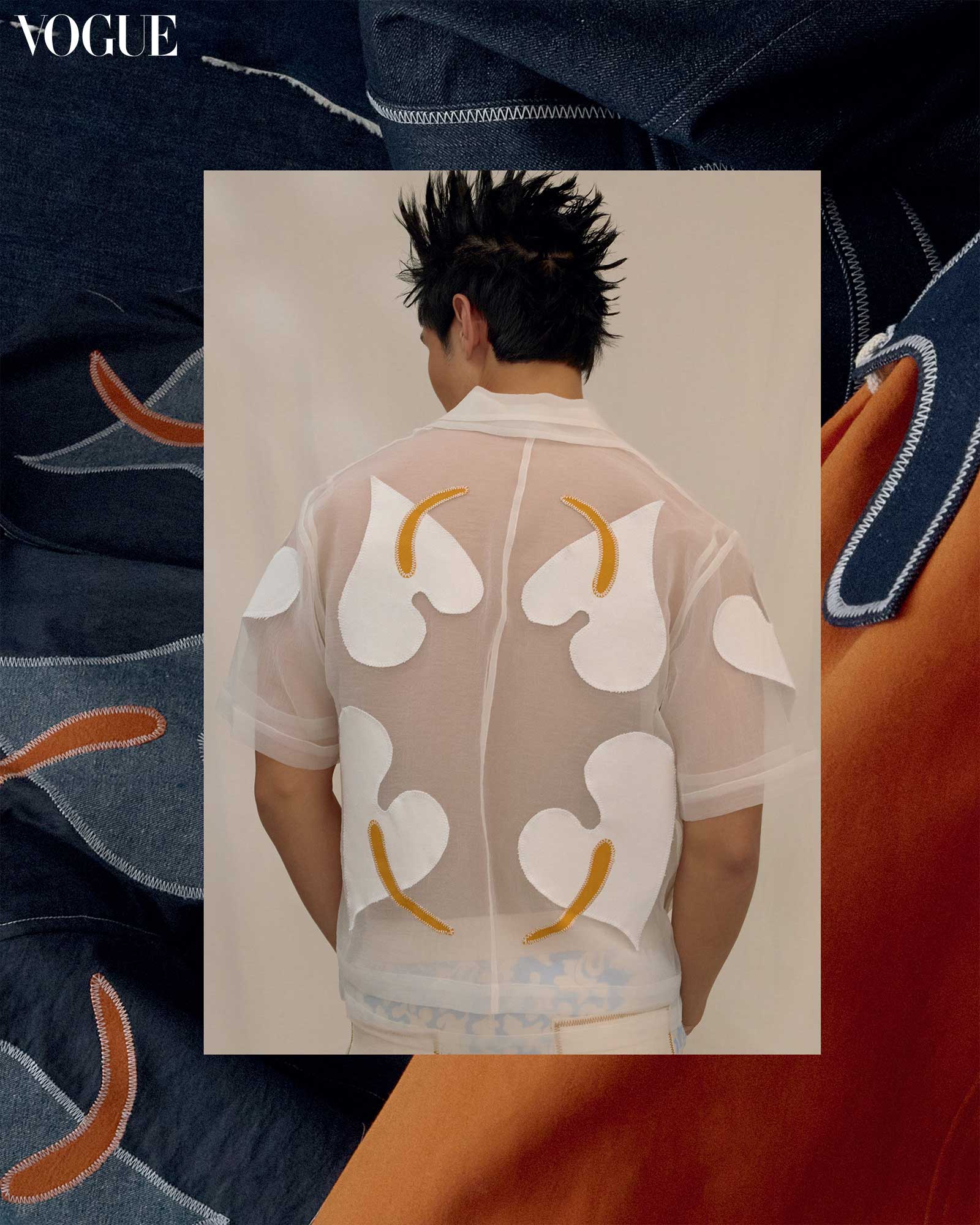 Inspired by the feeling of yearning for someone, the central motif was flowers, a gift you give to an object of affection. Anthurium and orchid-inspired blooms were appliquéd onto the brand’s favored sheer and denim fabrications, adding novel textures to familiar shapes. Amorphous, symmetrical splotches of color immediately register as Rorschach inkblots, an overt nod to the designer’s psychology background. Multi-pockets, curved hems, and zigzag stitches are present throughout; grounding elements that characterize a Nicolò piece.