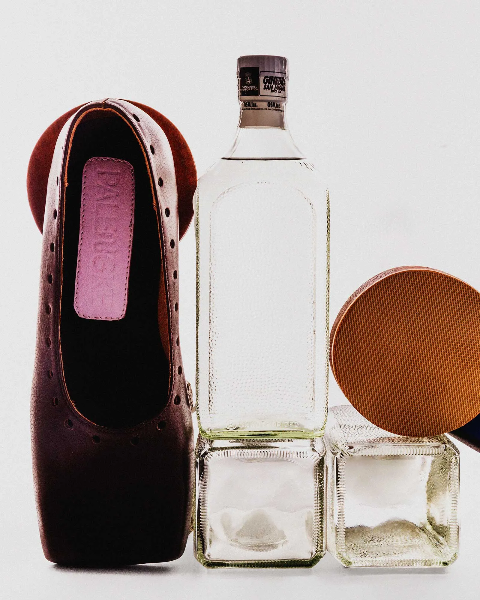 Concepts often grow out of conversation. The Kwatro Kantos heels, for example, were inspired by the Ginebra San Miguel square bottles found on Manila street corners. Its form, a wide square toe with a rounded wooden base, became a study in Memphis-like design and mood. “We try to put our twist to the things we see around us,” Paulina says. “We don’t take them literally. It’s about the feelings we attach to them.”