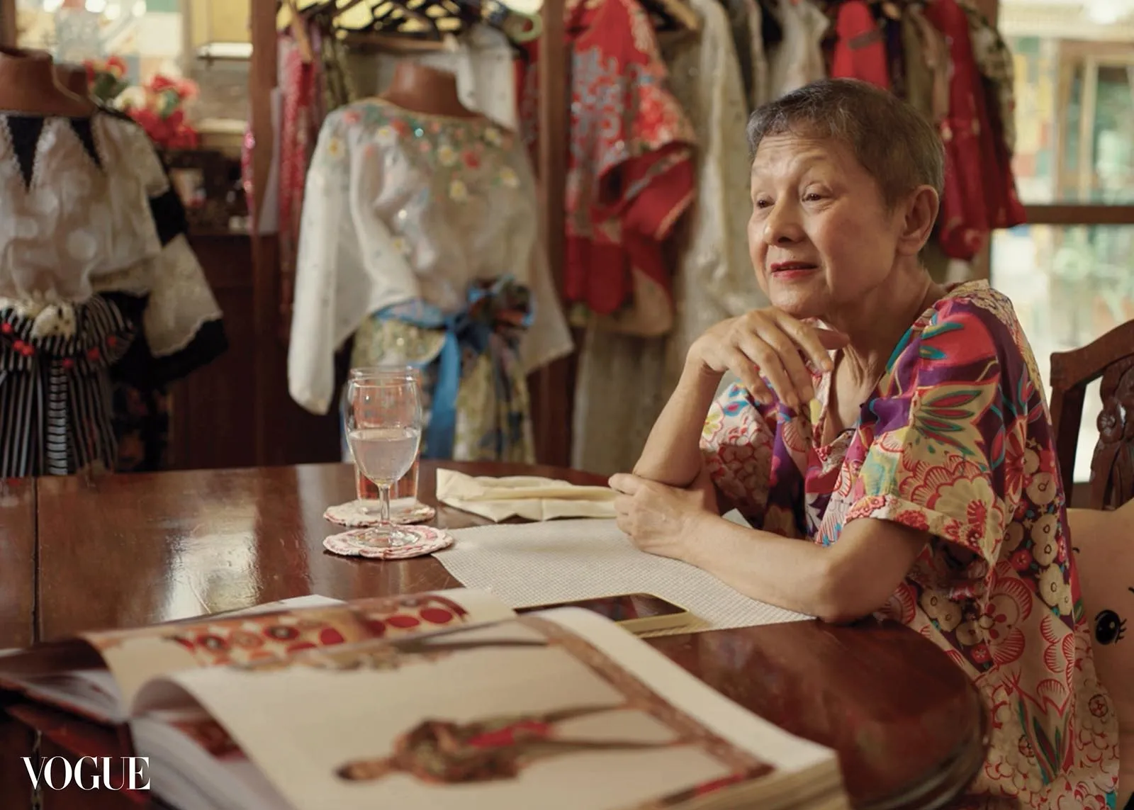 A low hum of soft chatter and sewing machines whirs from the adjacent room on the left, where artisans and artists work on made-to-order pieces, and more urgently, the collection Tesoro would present the next day, during the unveiling of her documentary and four-kilo book spanning five decades of work, both titled Filipiniana Is Forever.