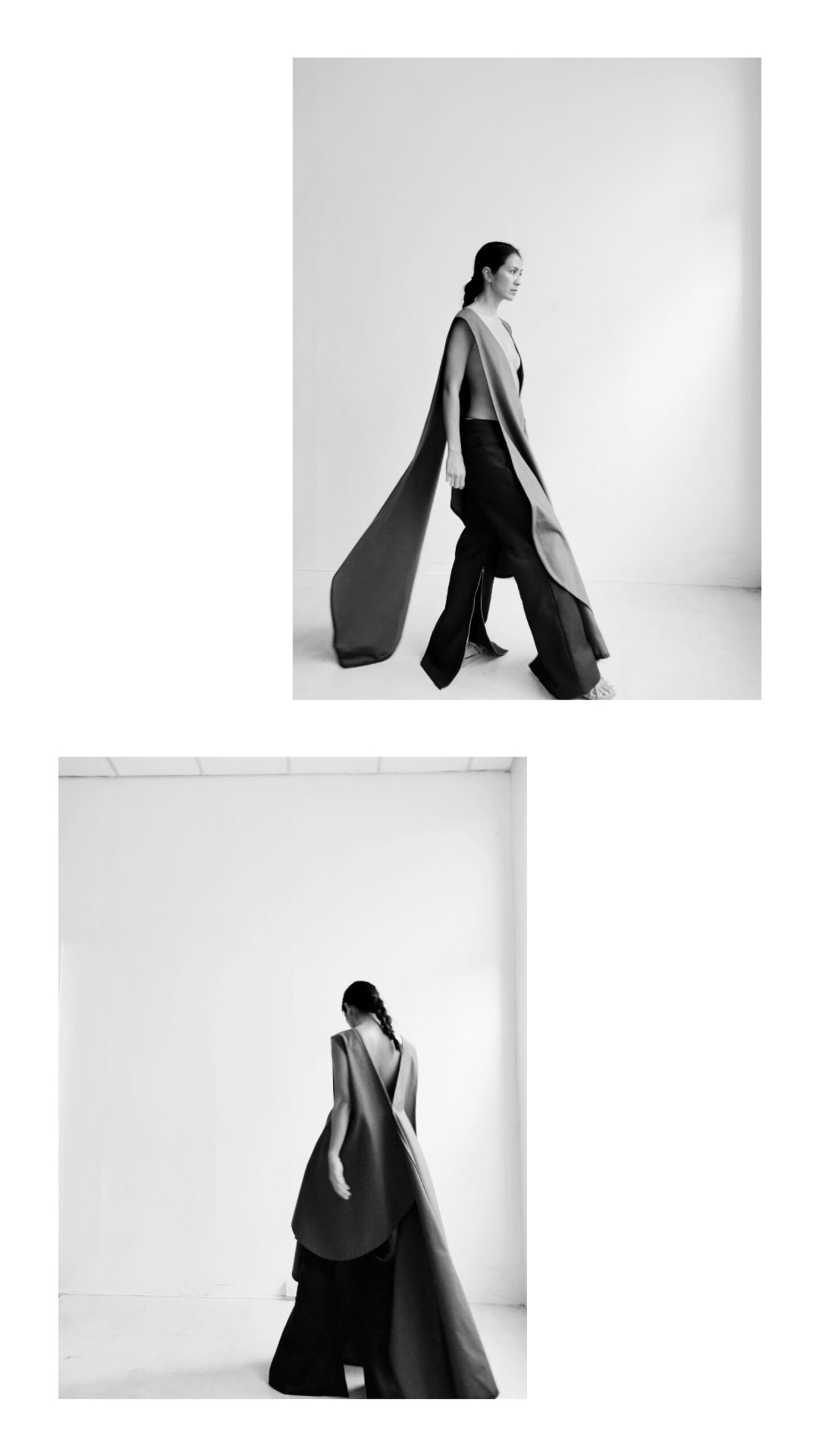 Each deconstructed garment is not done haphazardly; rather his garments are infused with principles in design and consider both form and function. “For instance, ‘repurpose’ recycles vintage clothes into something new by re-cutting them,” he elaborates, “While ‘reengineer’ on the other hand, proposes a new silhouette out of a reconstructed pattern. Meanwhile, ‘reassemble’ represents structural components that can be worn in more ways than one.”
