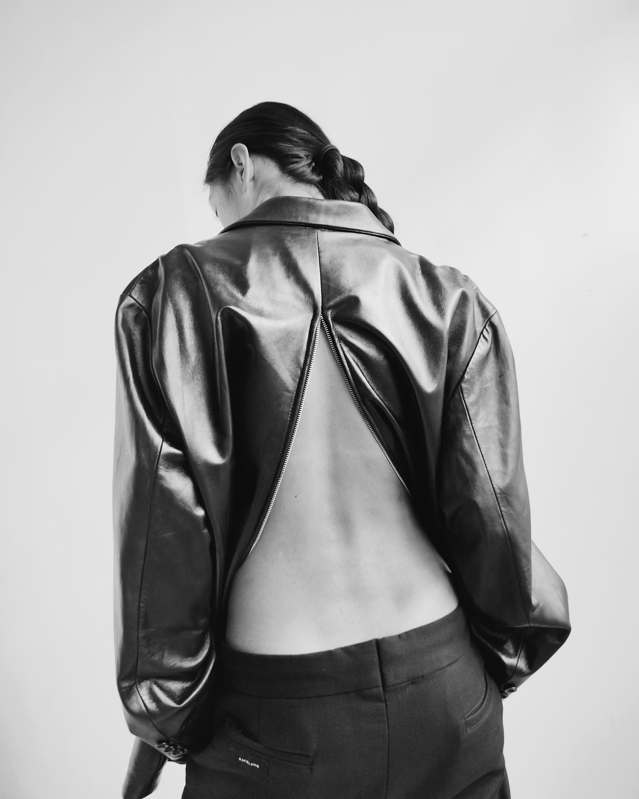 “To produce each piece, I revisited some of the works I’ve done in the past,” he tells us. “The zipper collection I presented in 2008, my winning piece from a Project Runway challenge titled Self-Deconstruction in 2009, which was based on sustainable fashion, and those leather pieces I made in 2010.”