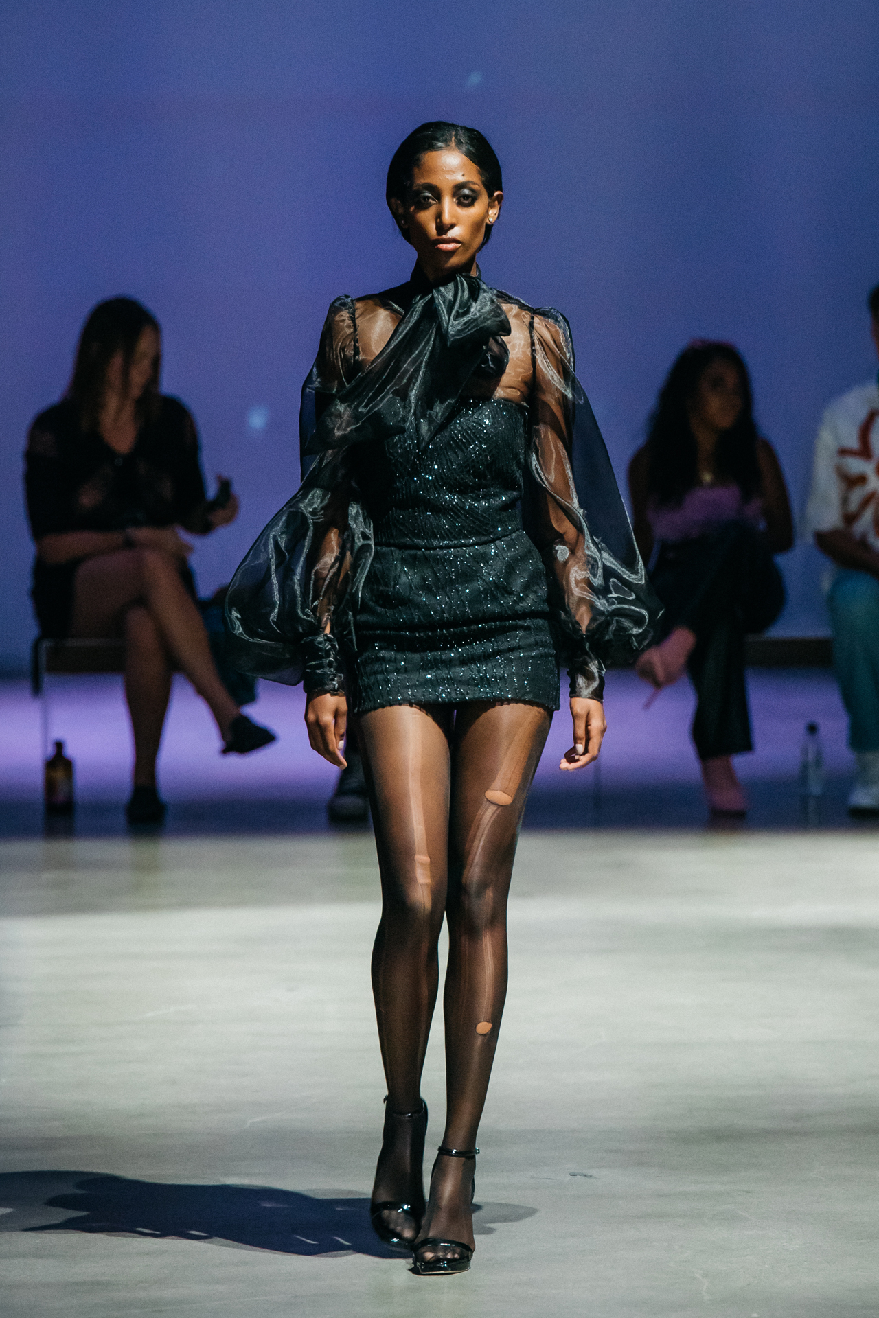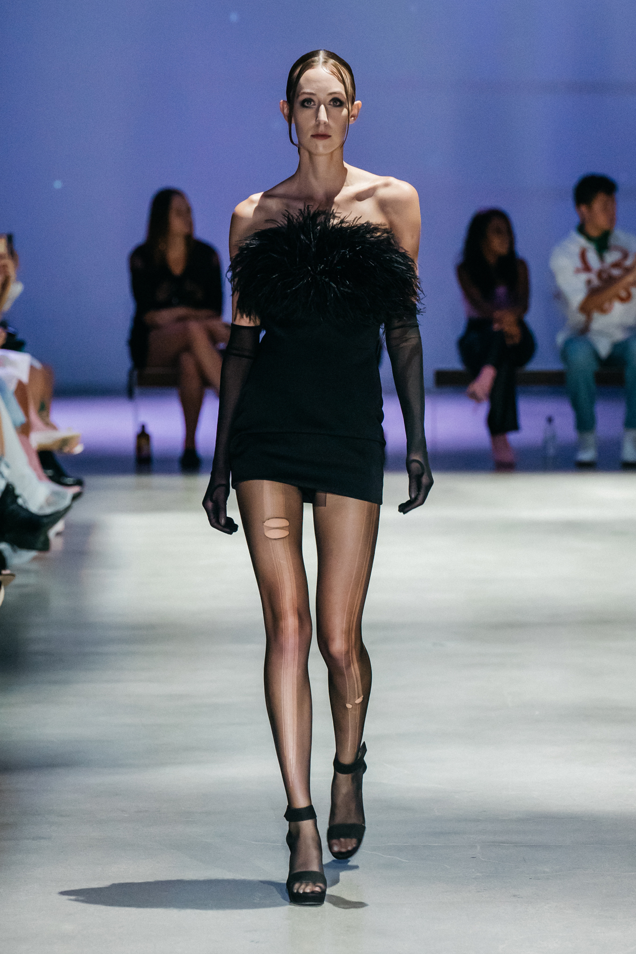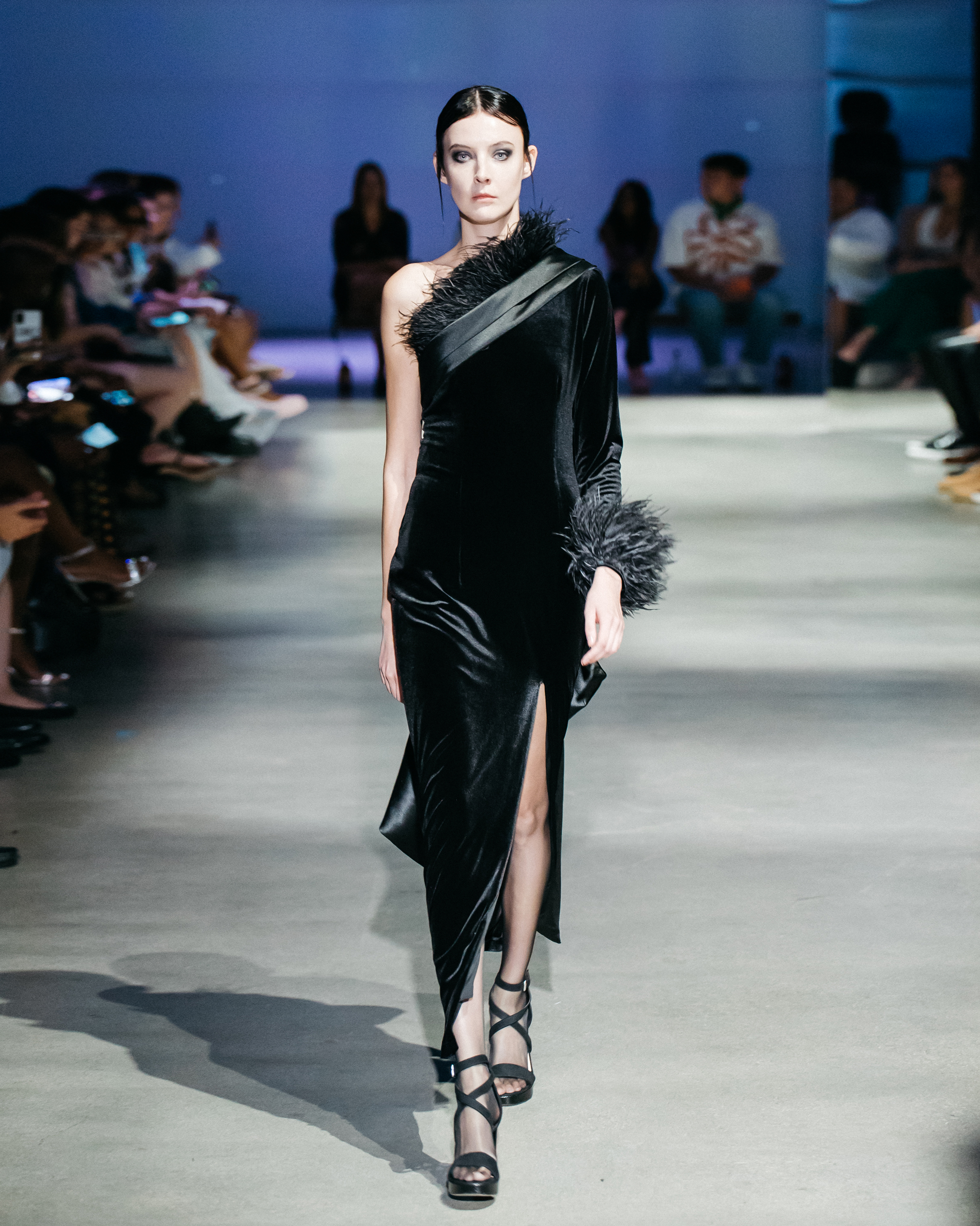 This season, Chris Nick’s designs heavily referenced ’90s minimalism and grunge with a tribute to his favorite article of clothing—the tuxedo. His opening act was a sparkly, scoop-neck, high-cut bodysuit accompanied by beautifully constructed sleeves paired with a matching skirt to create that sultry hip cut-out. Nick goes all out with the playful hems, feathered trims, and micro minis as an ode to his brand ethos of Old Hollywood. A proponent of understated elegance, he abides by the tenet that clothes shouldn’t wear the wearer.
