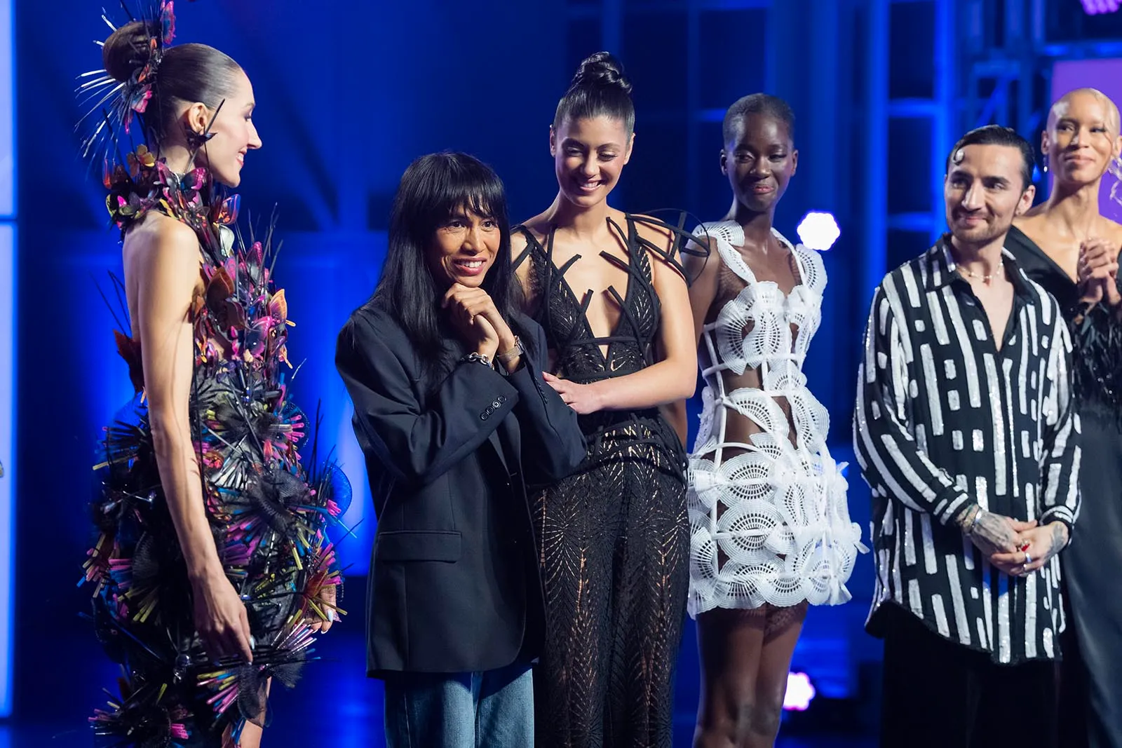 Her collection of monochromatic, Richard Serra-esque curves and sculpted folds, capped by a final look of an asymmetrical draped chainmail gown, impressed judges Heidi Klum, Nina García, Law Roach, and Michael Kors. “Every rejection, every challenge prepared me for this,” she says. She achieved a landmark win as the first openly transgender woman to take the Project Runway title in the United States, dedicating it to her community.