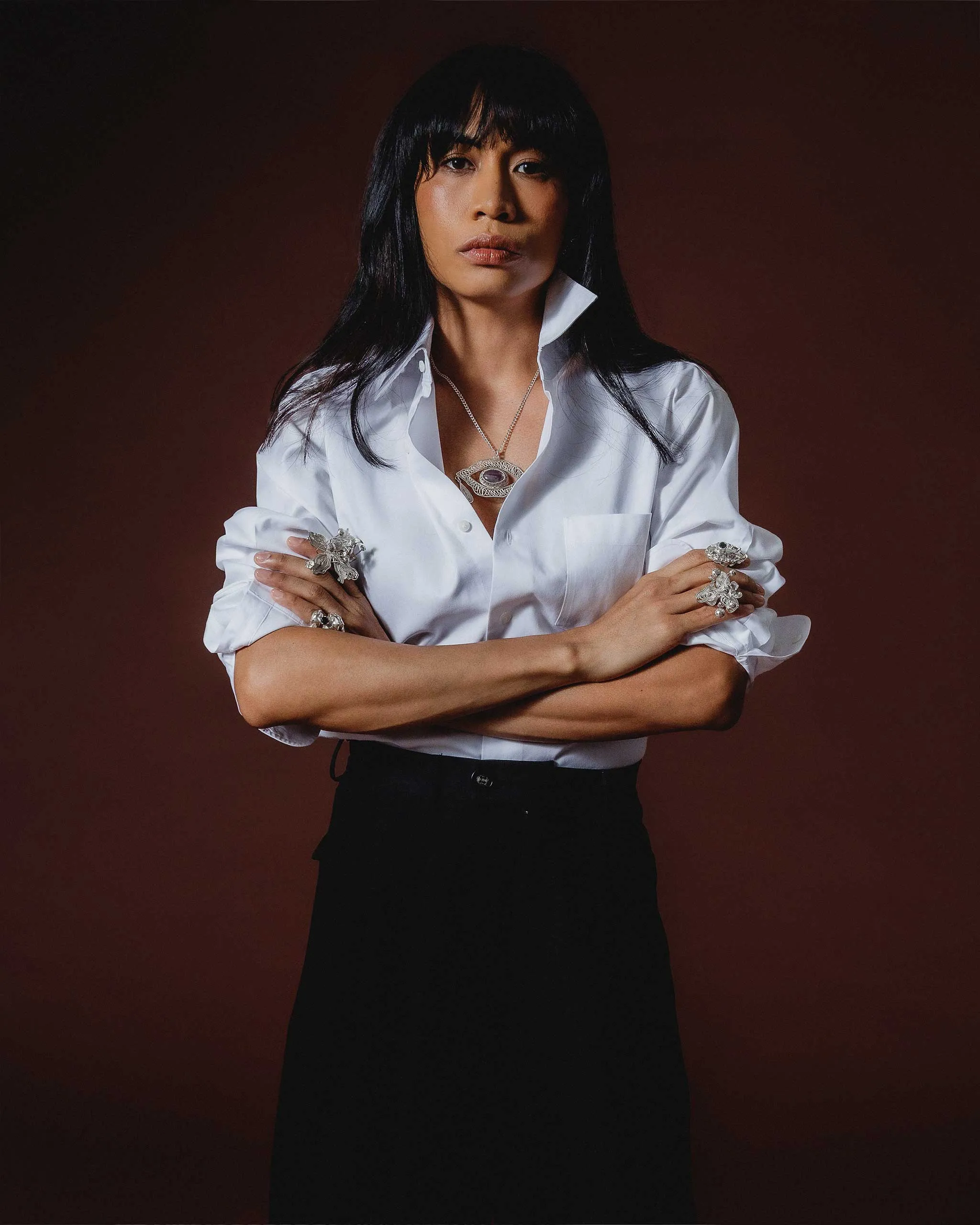 In a nation where weddings are big business, she has designed bridal gowns for over five hundred clients. “I was one of those designers in the Philippines known to be a bridal designer,” she says. “I remember attending several weddings; sometimes four, sometimes seven, in just two days. But it was fun, being part of their special day.” Those years strengthened her ability to work under pressure. While she admires the newly appointed Rachel Scott of Proenza Schouler, she has an appetite and appreciation for British designers like Stella McCartney, Phoebe Philo, and Harris Reed. “Seeing [him] follow me on Instagram was such a moment,” she confesses.