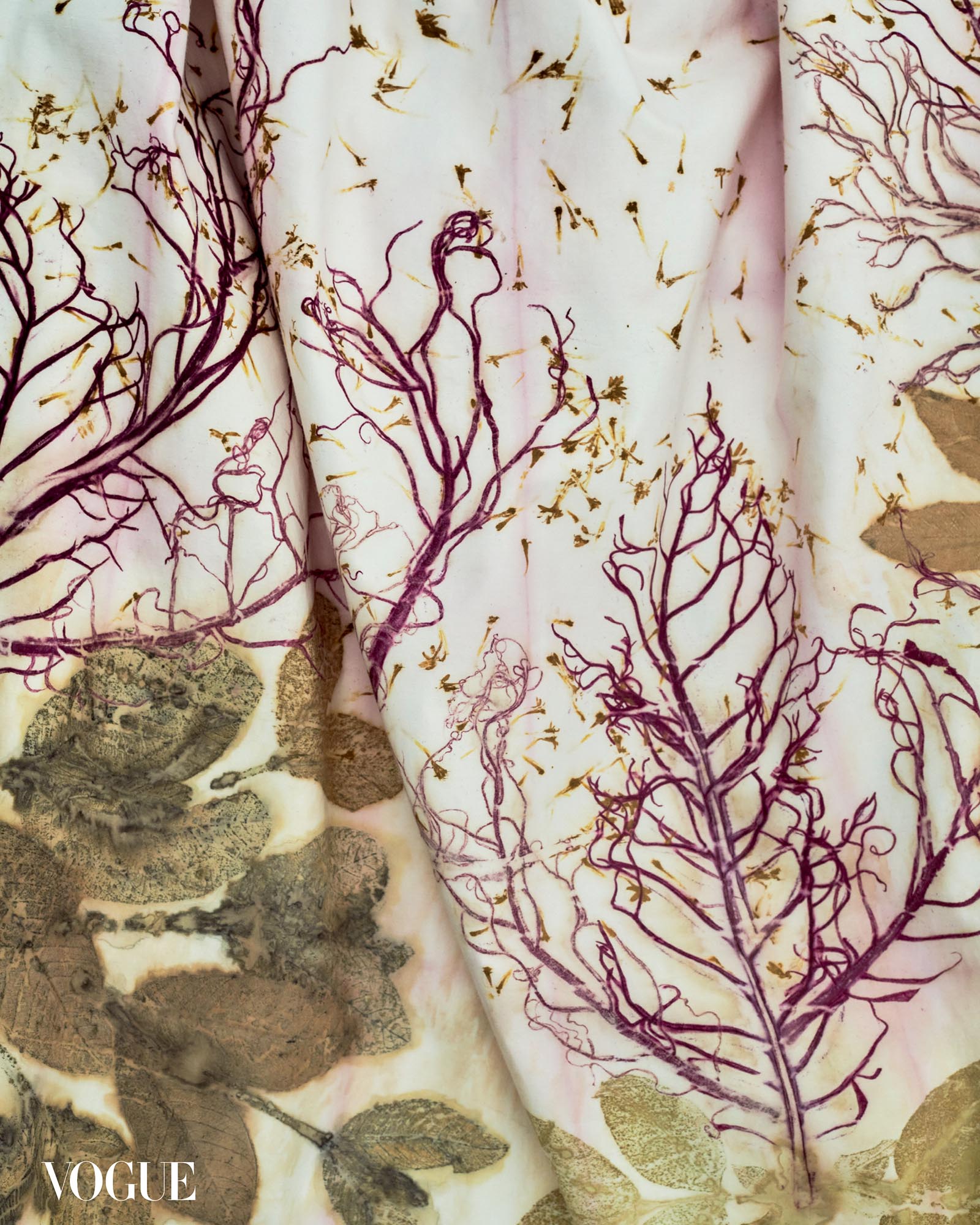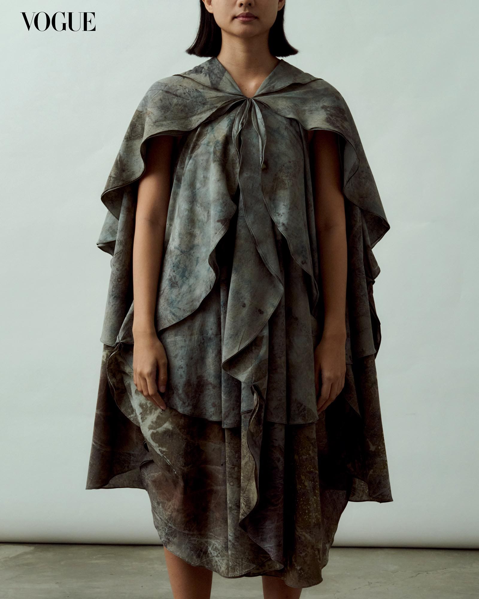 One of 25 looks that designer Steffi Cua created for Earthbound, using fabrics by artists Geraldine Javier and Marionne Contreras. “Geraldine and Marionne’s work are centered around nature, and its cycles of birth and decay, which became my starting point for the collection,” she tells Vogue. Photographed by Colin Dancel for the April 2025 Issue of Vogue Philippines