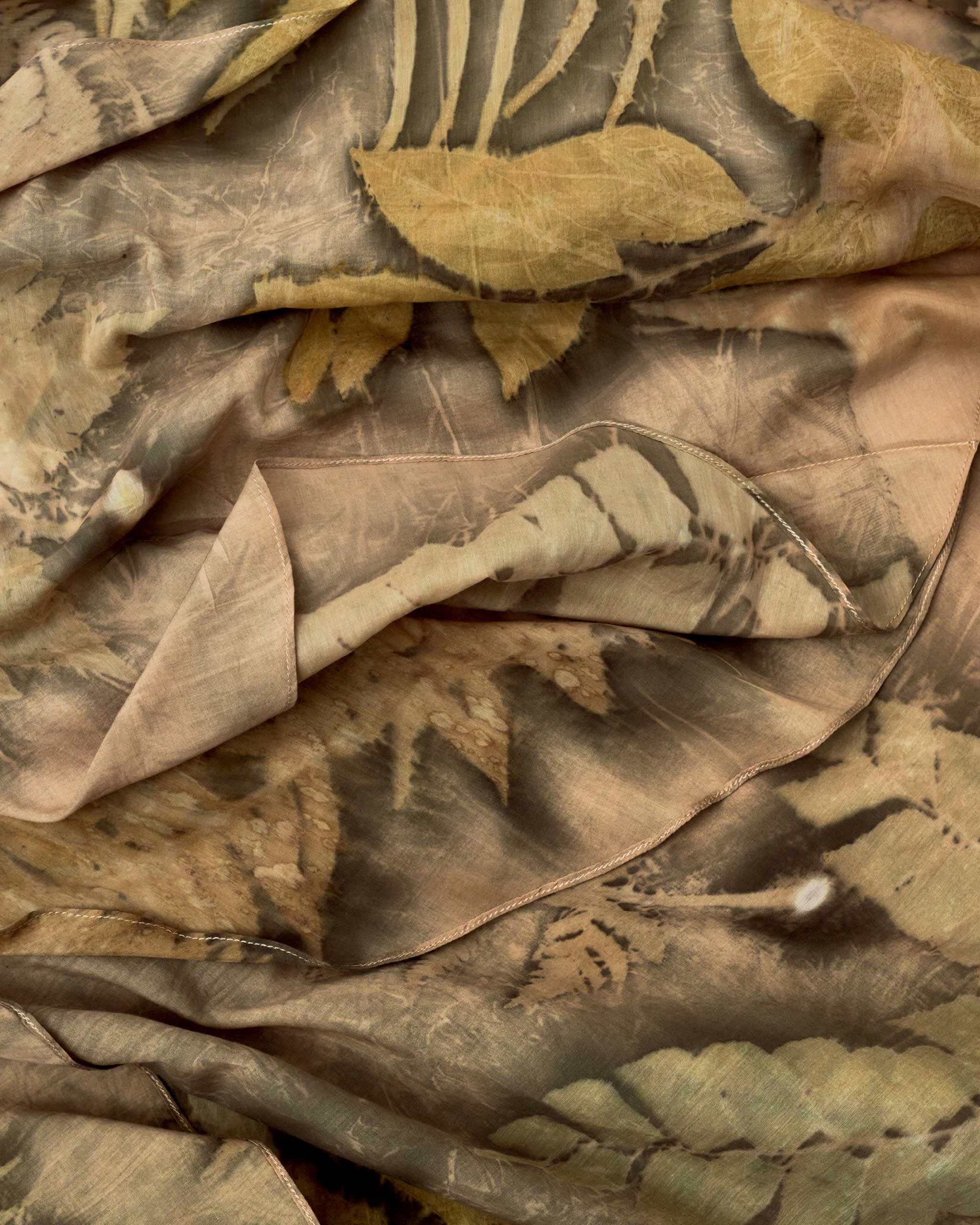 Cua made the decision to return to the Philippines and work with local materials, techniques, and people. Although crafting with artisanal textiles has become familiar to her, working on Earthbound has deepened her personal connection to the materials in ways she didn’t expect. “Knowing that each textile was ecoprinted by hand using plant materials collected from Geraldine and Marionne’s own backyards reminded me of how disconnected we often are from the origins of our clothing,” she ruminates. “We rarely think about who made our garments or where the fibers and dyes come from.”