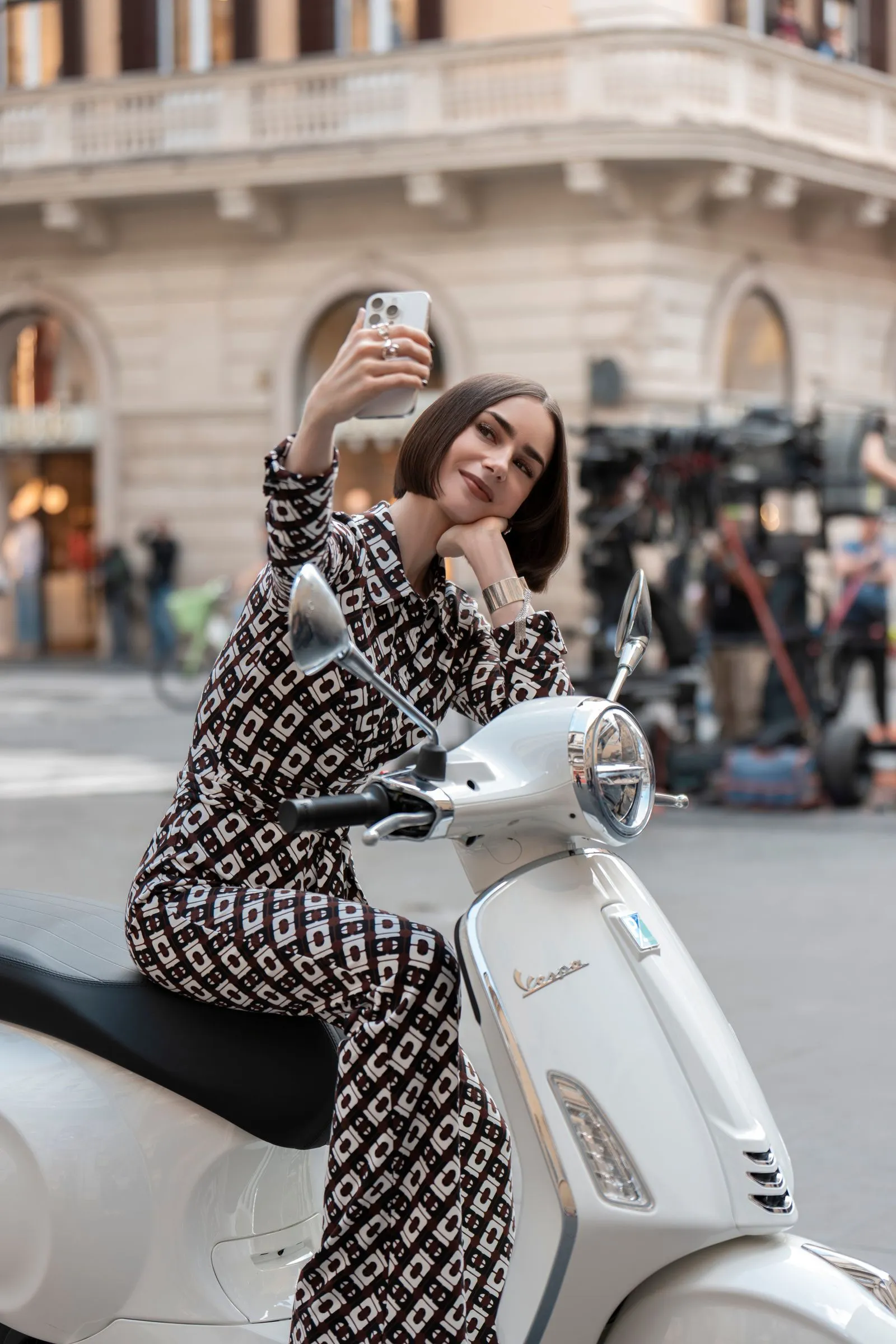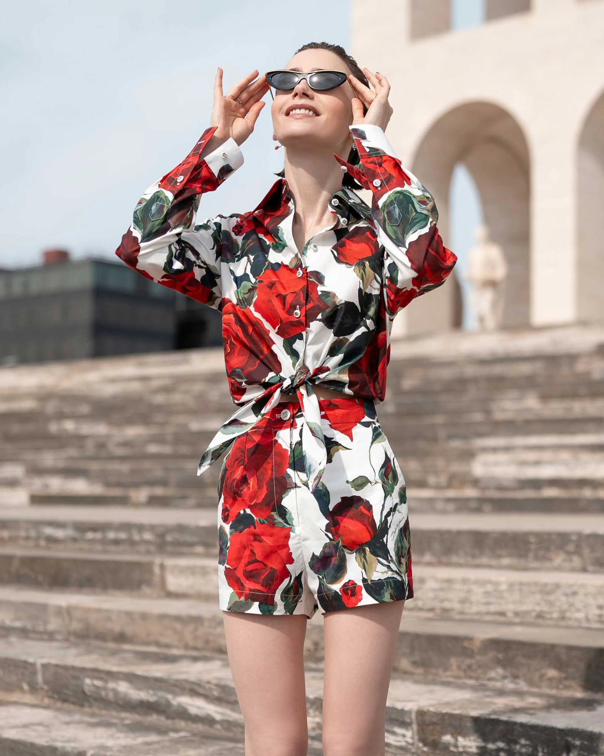 With her Eiffel Tower-printed blouses, retina-searing berets, high-low hemlines, and Audrey Hepburn cosplay, the Midwestern marketing executive made, er, quite a splash in the City of Light—and has been upping the ante ever since. Last season, upon relocating to Rome, there were a flurry of Roman Holiday tributes. But when we reunite with our heroine this time around, she’s much more settled in her new home. The clashing prints and occasionally mind-boggling impracticality remains, naturally, but there’s also a little more structure and grounding—more suits and jumpsuits, more trousers and shorts, a scarf tied at the neck to protect her from “colpo d’aria” (a hit of wind, as Emily explains), and more flats, all paired with Collins’s sleek new bob.