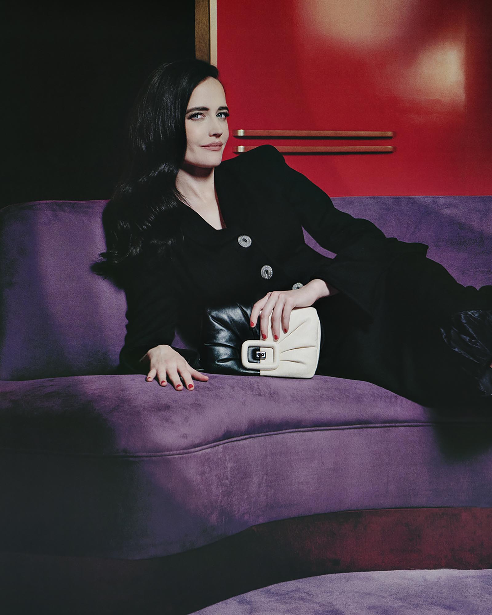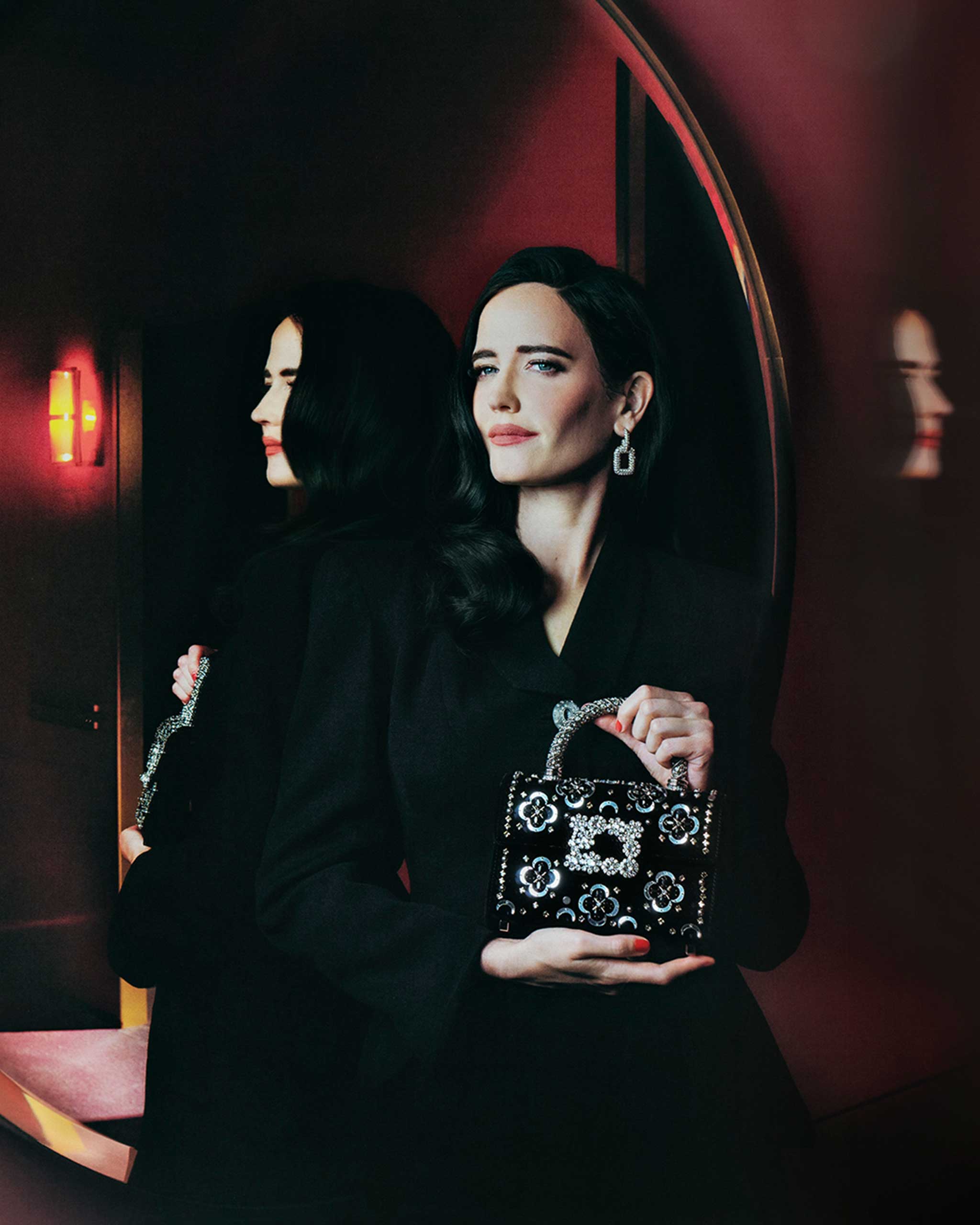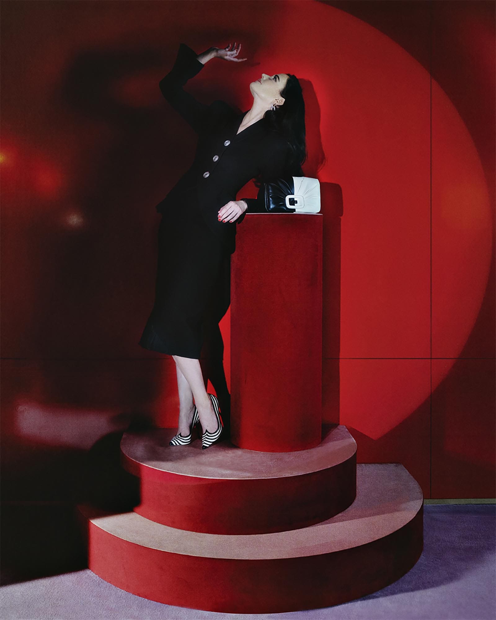 “Films noir have always fascinated me. It’s a world where shadows speak, and every glance hides a secret. I wanted Eva to be our modern-day femme fatale, because she doesn’t just wear the shoes and accessories; she brings them to life, infusing them with a sense of danger and desire,” Felloni says.