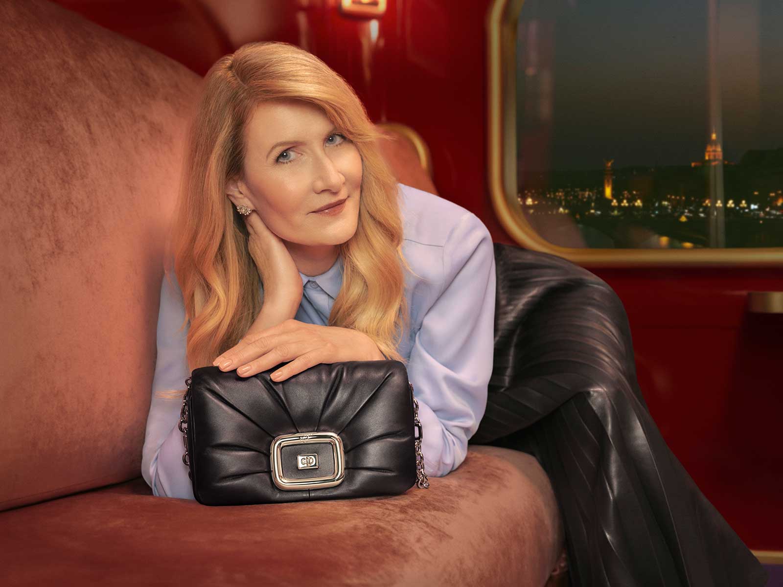 Since his appointment in 2018, creative director Gherardo Felloni has spurred the release of several short films that pay homage to Hollywood, French and European cinema, and its stars, casting Isabella Rossellini, Isabelle Huppert, Christina Ricci, Susan Sarandon, and even Deneuve herself in his vivid settings and humorous storylines. Today, Felloni announces the addition of a new series to his ode to classics, “Vivier Express: Travelling Icons,” with its first episode starring Oscar-winning actress and house muse Laura Dern.