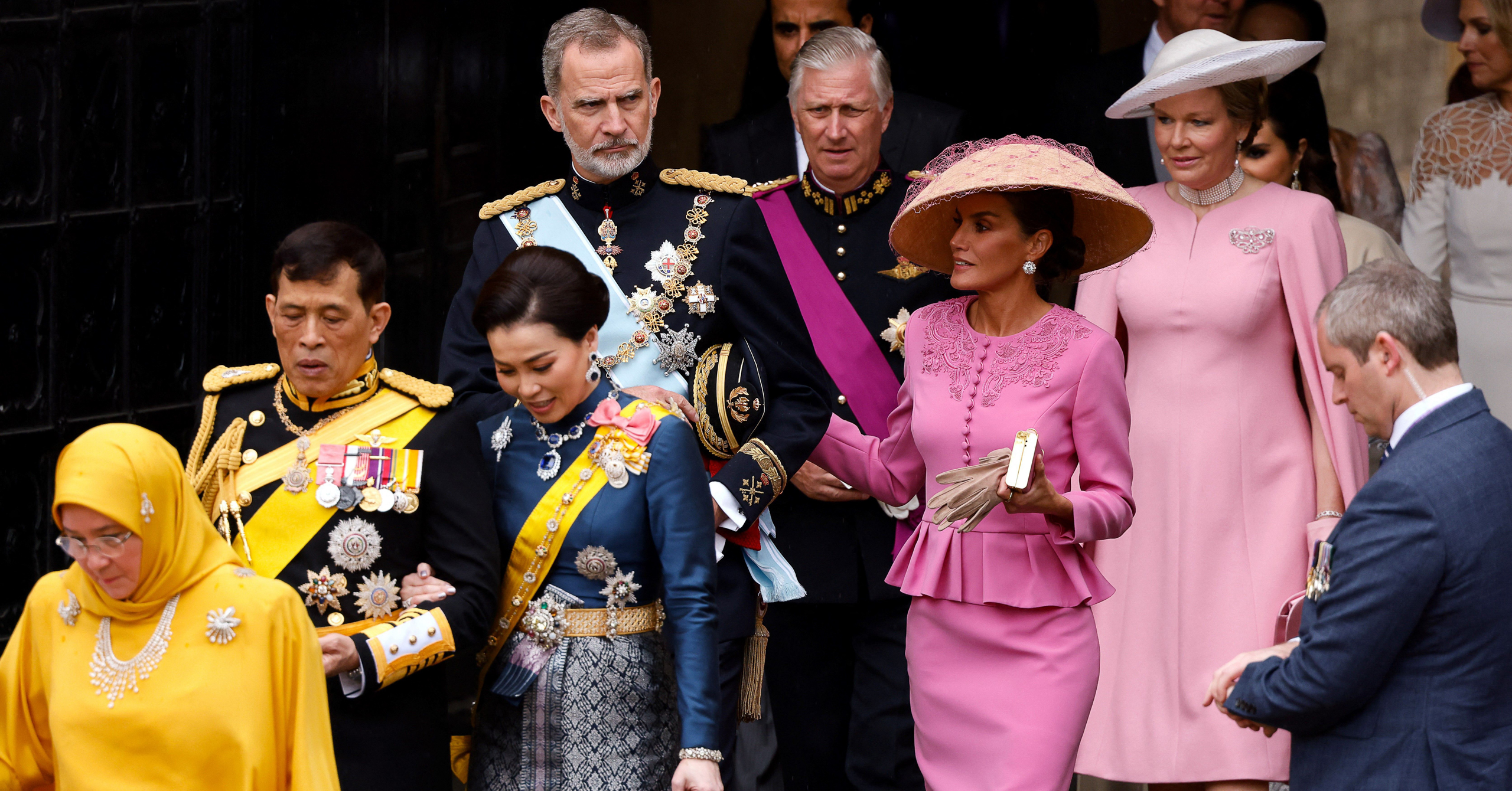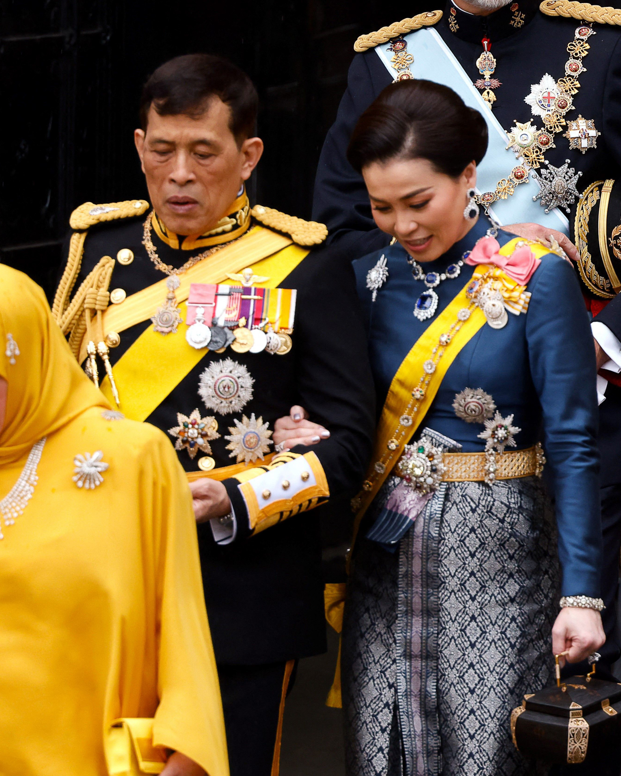 King Vajiralongkorn arrived in military uniform, decorated with honorable medals. He is accompanied by his wife, Queen Suthida of Thailand, who wears traditional Thai dress comprised of blue and silver accents, bedecked with diamonds and sapphires.