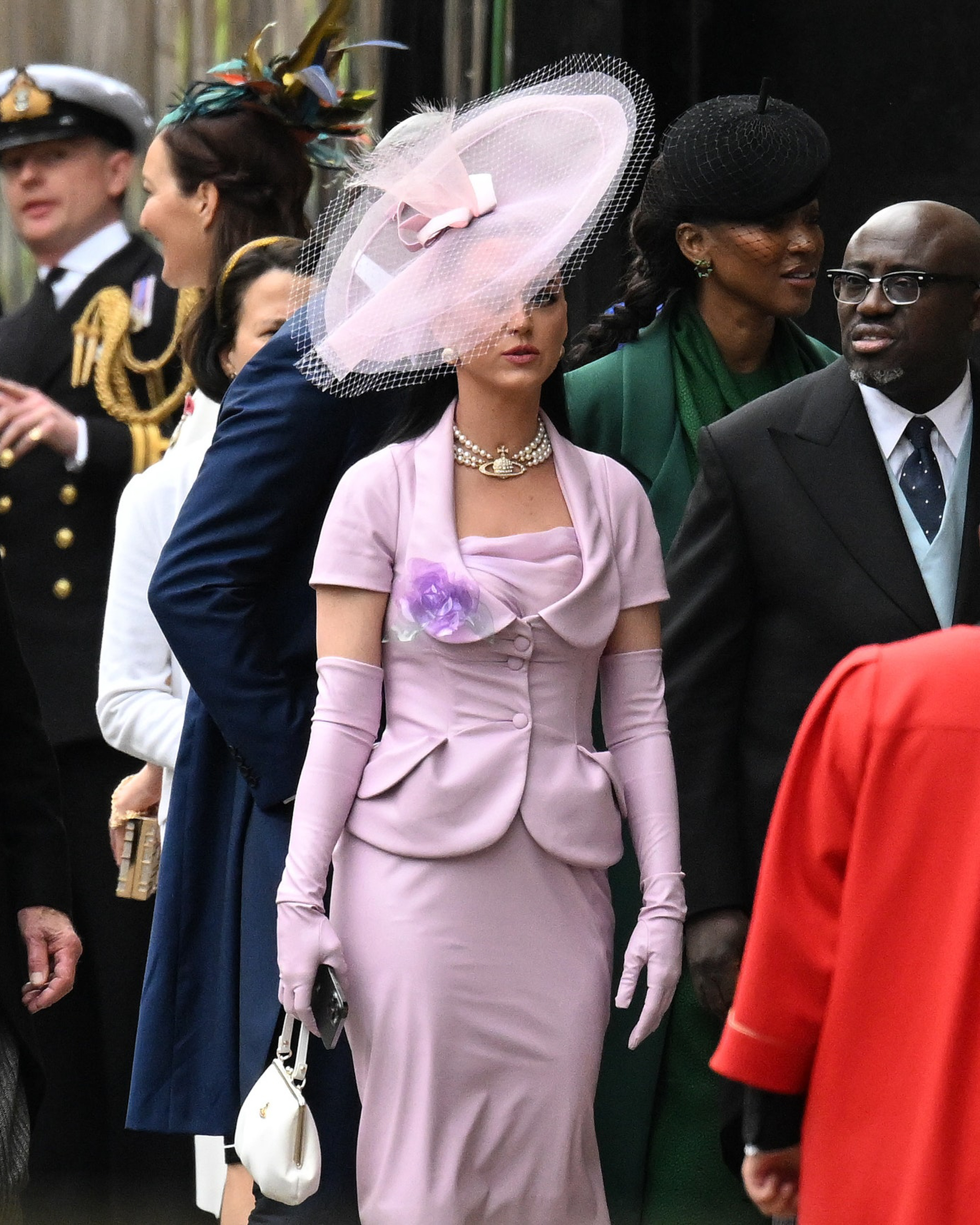 Katy Perry, Sunday’s coronation concert headliner, pays homage to late British designer Vivienne Westwood by wearing her signatures in the form of a lavender pink suit set, complete with matching opera gloves and a fascinator to end all fascinators. Fittingly, she adds a white purse and the Three Row Pearl Bas Relief choker to finish off the look.