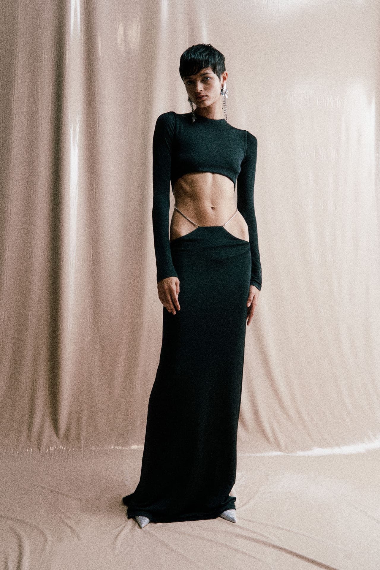 The result: Open, wavy seams that curl up across the shoulders, sharp cut-outs that instinctively fall below the waist, and a svelte assortment of ruched knitted minis that flatter the wearer’s shape. “We want to celebrate the exquisite transient beauty to be found in all things impermanent. The collection captures the primitive sensitivity and subtle sensuality of flora,” she says.