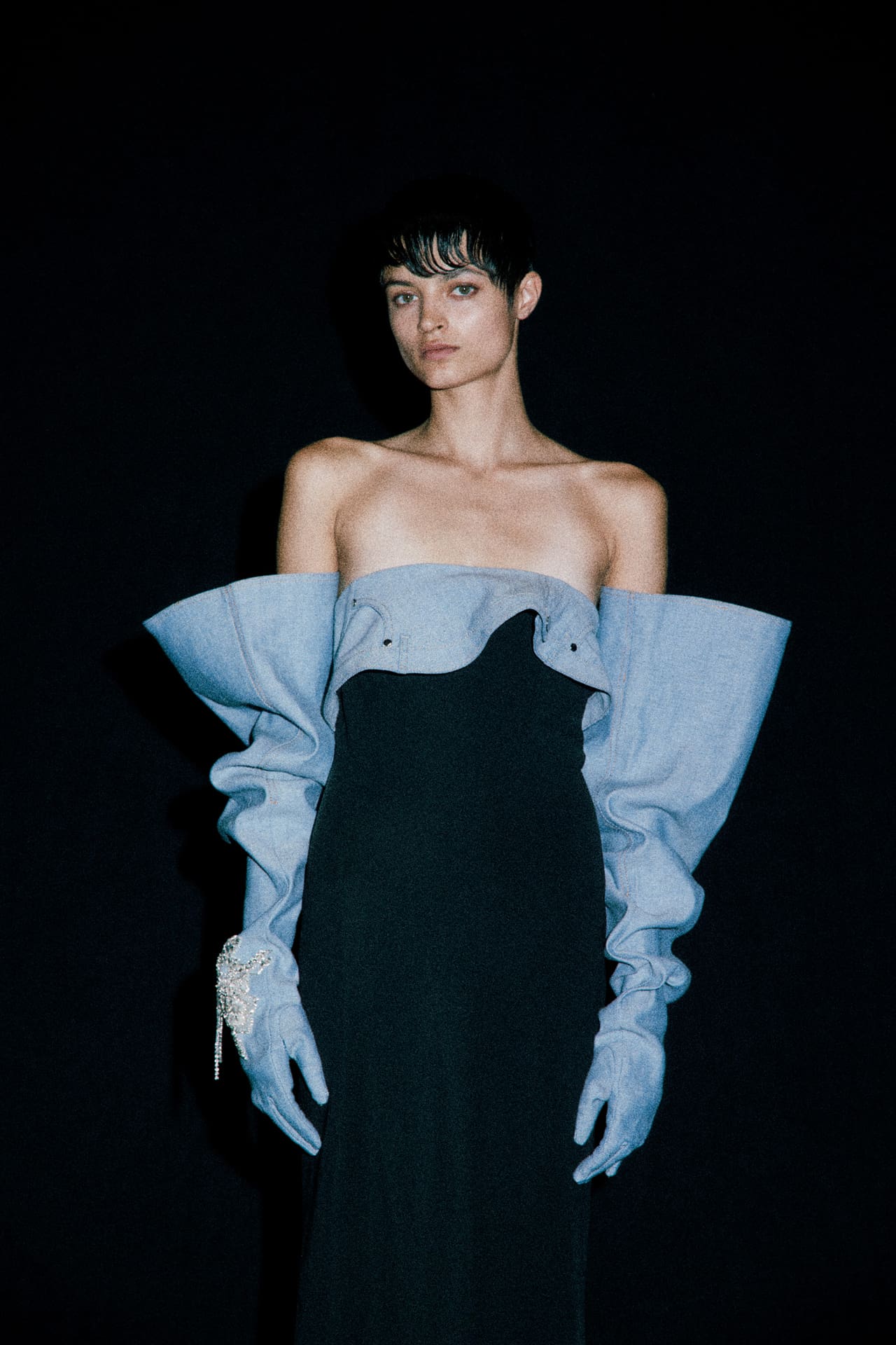 The designer continues: “Rebalancing opposing elements, sensuous ruffles are gathered, stacked, and preserved into pragmatic Japanese denim, while fragile botanical motifs are molded into graphic crystal-encrusted embroidery and carved chrome custom hardware.”