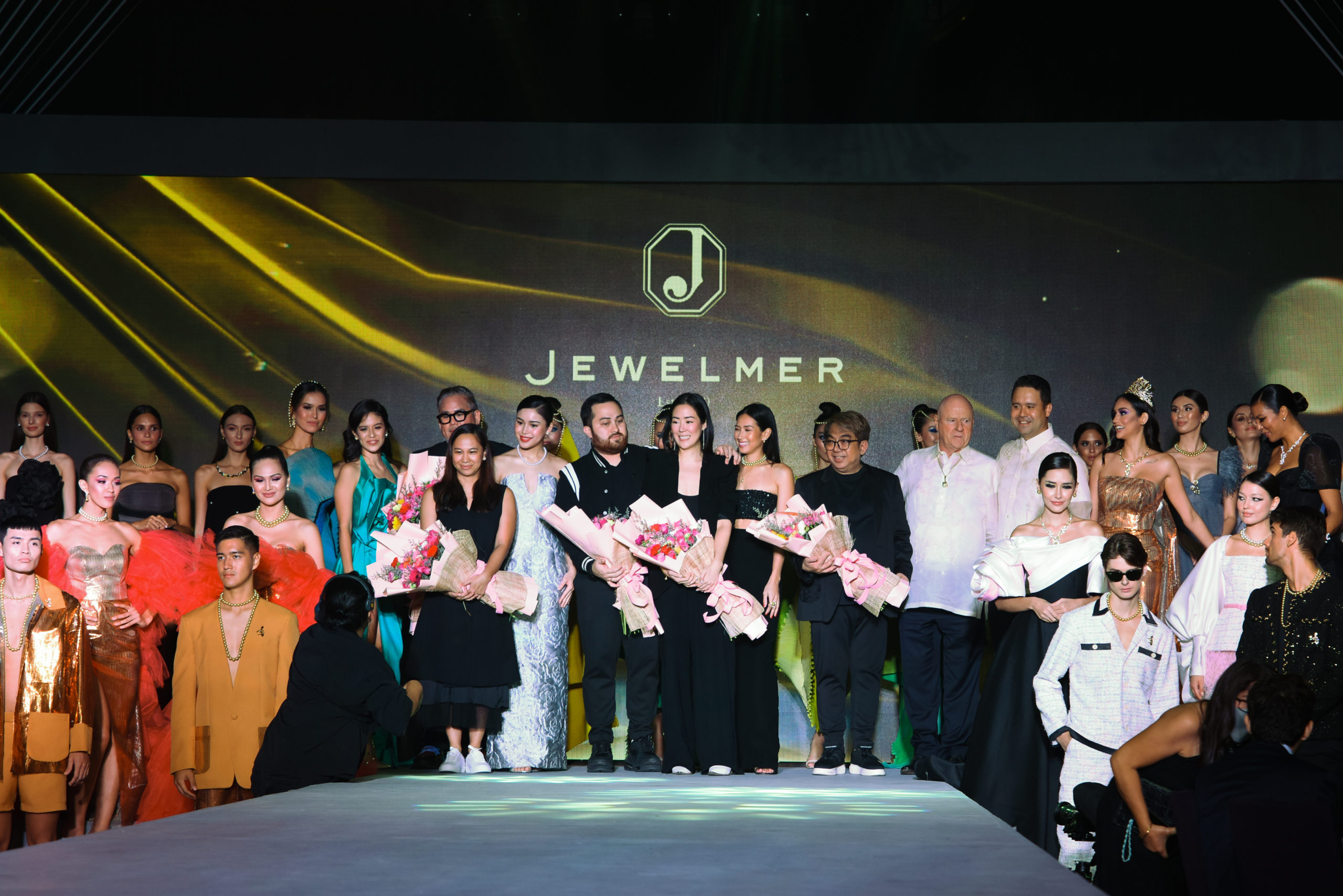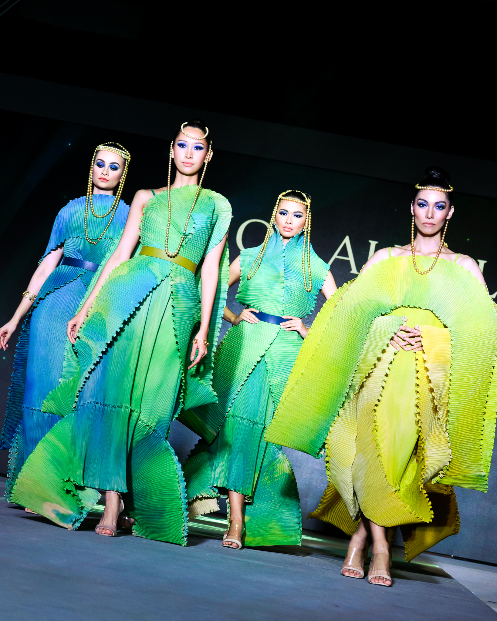 Fashion designer and TV personality Rajo Laurel showcased several artfully draped crinkle-pleated gowns in various tie-dye hues of blues, greens, and yellows. His muses included Binibining Pilipinas Elda Louise Aznar, Binibining Pilipinas International Hannah Consencino Arnold, Miss Eco Teen International Tatyana Alexi Austria, and model Taki Yoneyama. Each of them wore a string of gold South Sea pearls around their heads in various combinations.