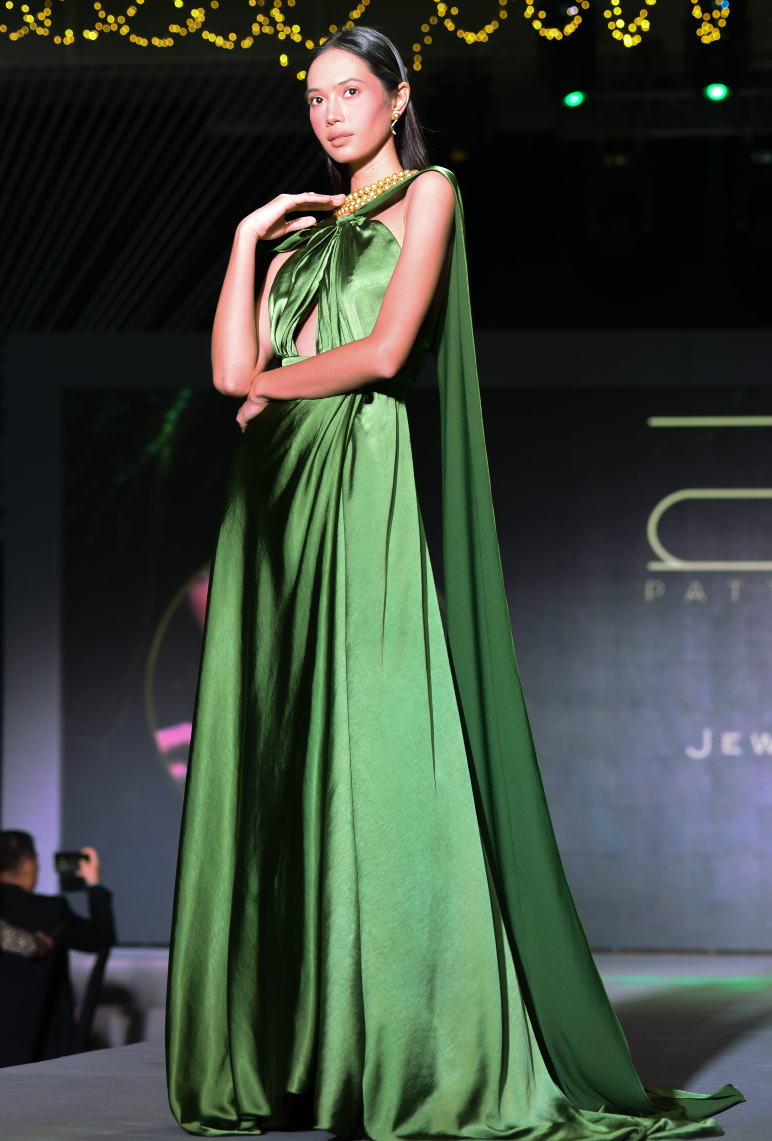Designer Patty Ang sent five examples of understated elegance down the runway. Her muse, model and lifestyle personality Mikaela Lagdameo, wore a shimmering black beaded bandeau and straight-cut skirt. Her other models wore sleek gowns with blue gradients melding into black, accentuated with rosettes, and a simple strapless cocktail dress beaded with pearls. Ang’s last look was a draped emerald green gown with a cape. The models wore statement necklaces with large Jewelmer pearls.